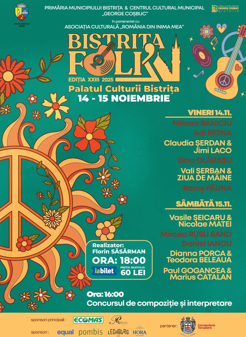Festivalul concurs Bistrița Folk 2025 se va desfășura în perioada 14 – 15 noiembrie 2025, la Palatul Culturii din Bistrița.