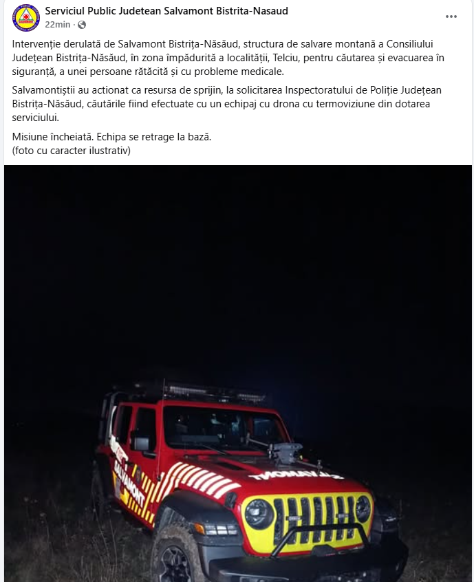 „Polițiștii Serviciului de Investigații Criminale Bistrița-Năsăud, alături de cei ai Secției 6 Poliție Rurală Năsăud, polițiștii Formațiunii de Investigații Criminale a Poliției orașului Năsăud, salvamontiști și voluntari au desfășurat căutări pentru găsirea unei femei de 48 de ani, din Telciu, cu probleme de sănătate.