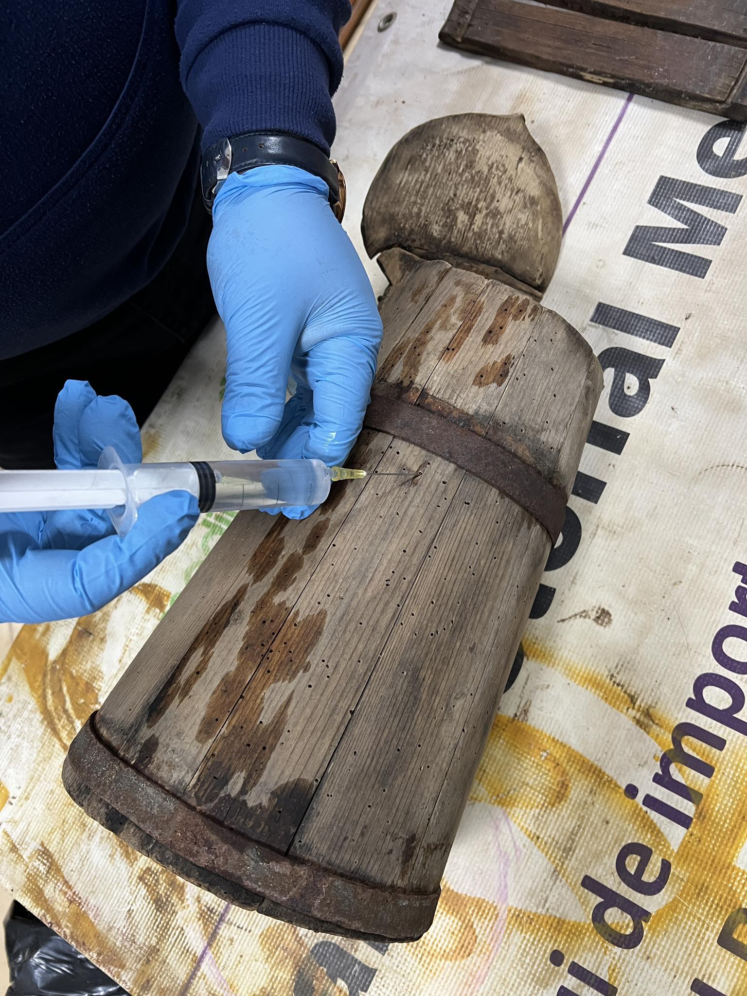 În imagine, activitatea unui restaurator care injectează o piesă de lemn cu substanțe conservative. Imaginați-vă că fiecare galerie de carie trebuie injectată. Imaginați-vă câte galerii de carii sunt în sutele de mii de piese de inventar din muzeele României.