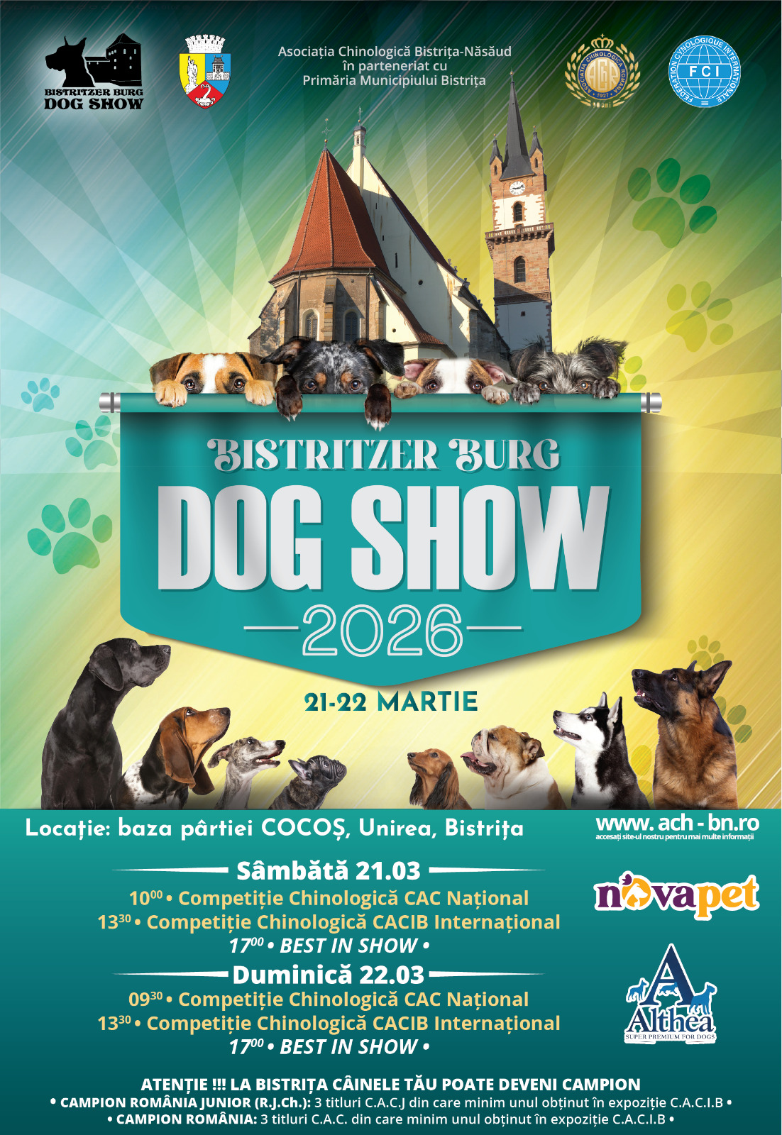 Astfel, sâmbătă, 21 martie 2026, începând cu ora 10.00, sunteți așteptați la baza Pârtiei Cocoș. Va începe competiția Chinologică CAC Național, iar la ora 13.30 va avea loc Competiția Chinologică CACIB Intrnațional.
