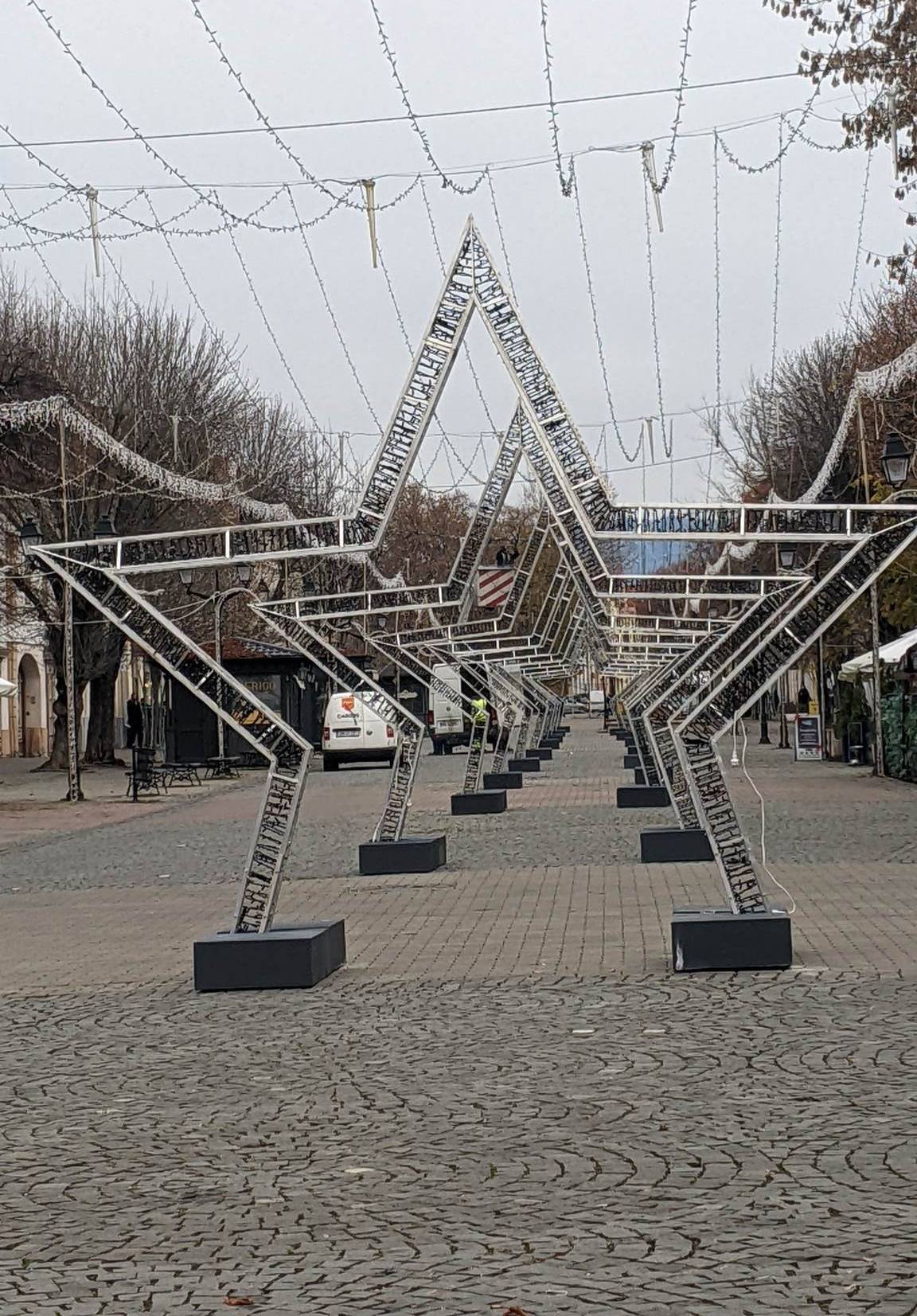 Pietonalul sau Centrul Bistriței prinde an de an altă culoare și alte forme. Din nou, bradul natural lipsește, dar a fost înlocuit cu unul construit din panglici luminoase. Pe lungimea pietonalului au fost amplasate elemente luminoase și stele care formează un pasaj.