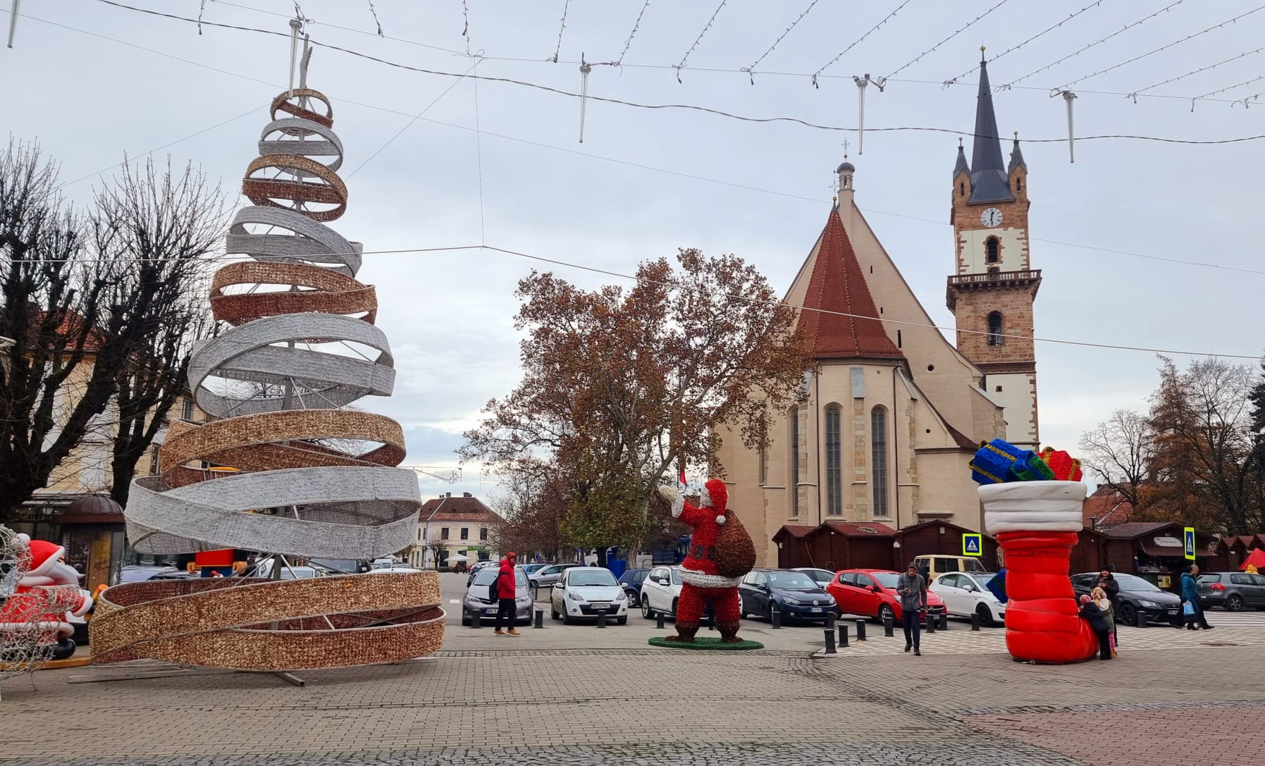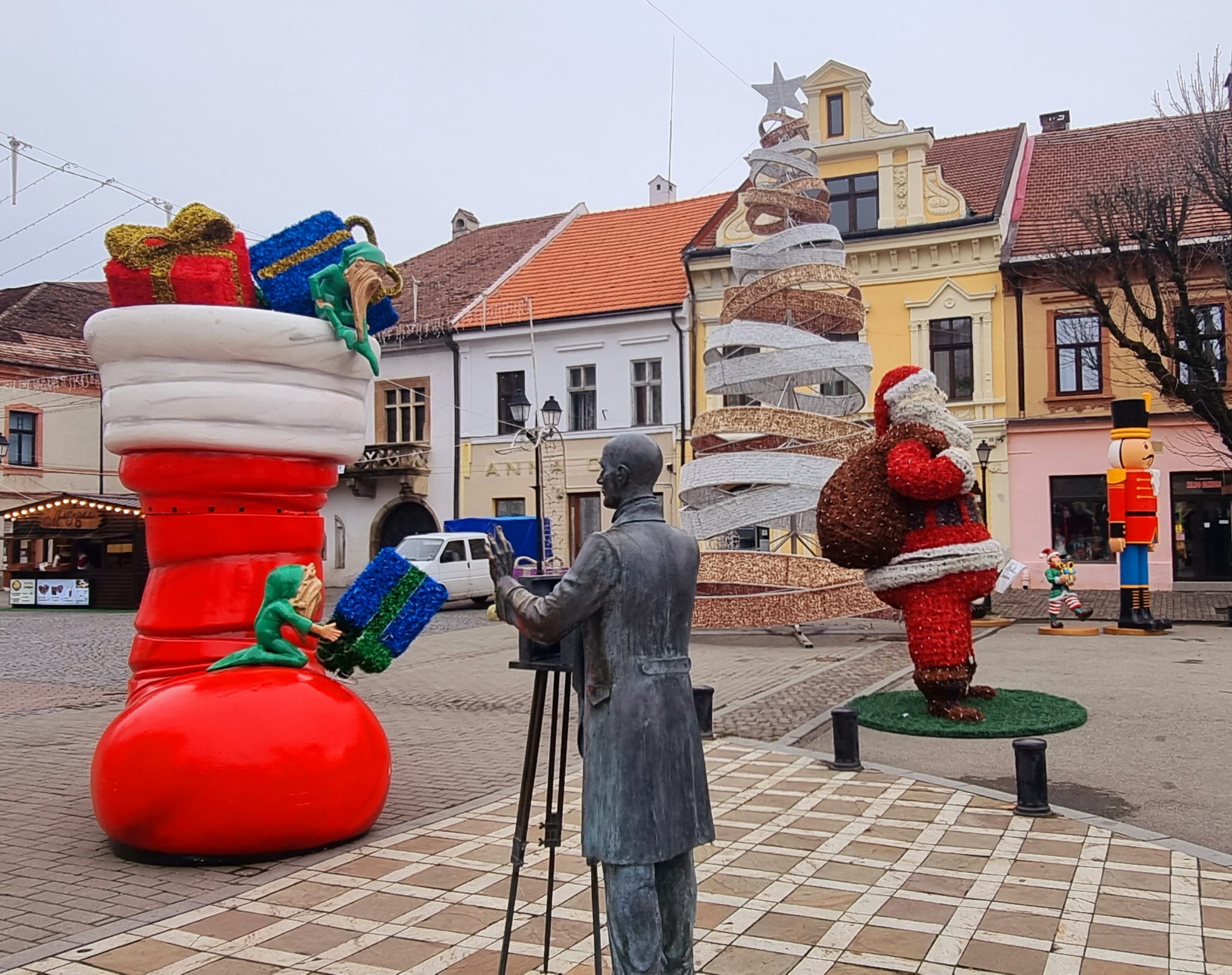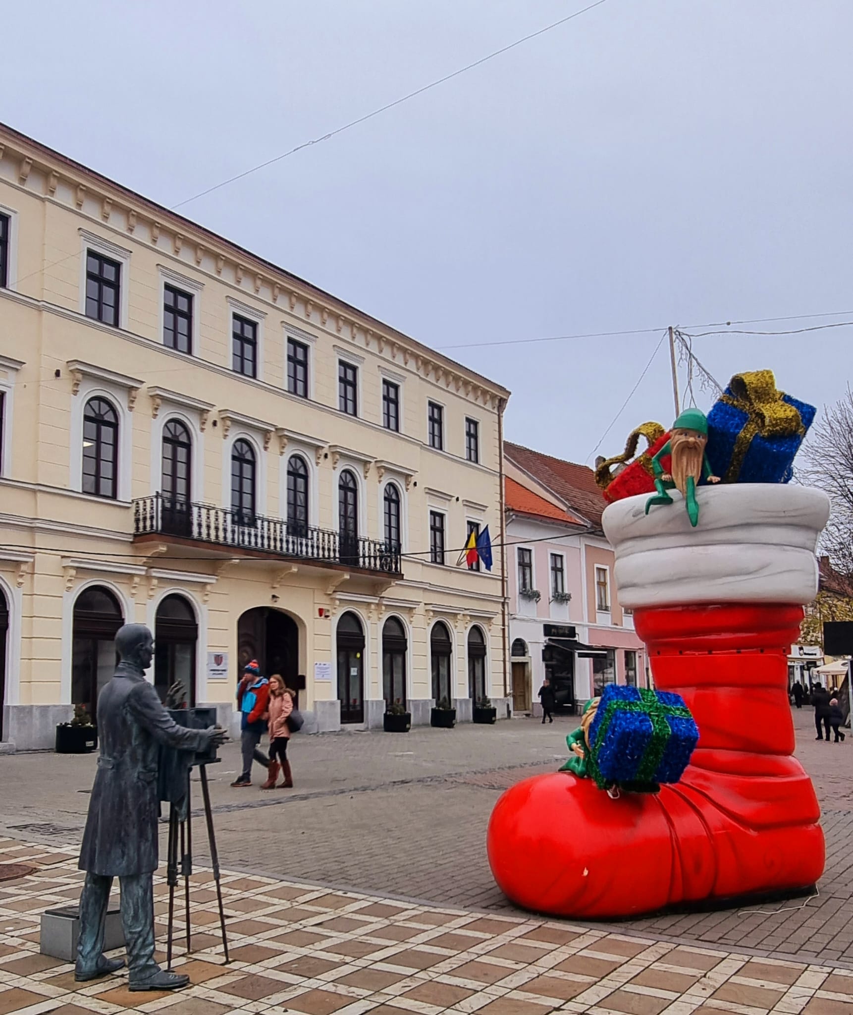 Tot pe pietonal au fost aduse și două elemente decorative noi, un Moș Crăciun și o cizmă uriașă plină de cadouri.