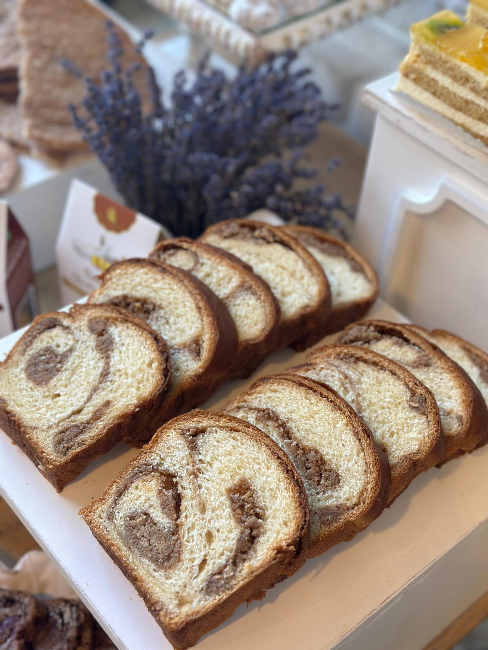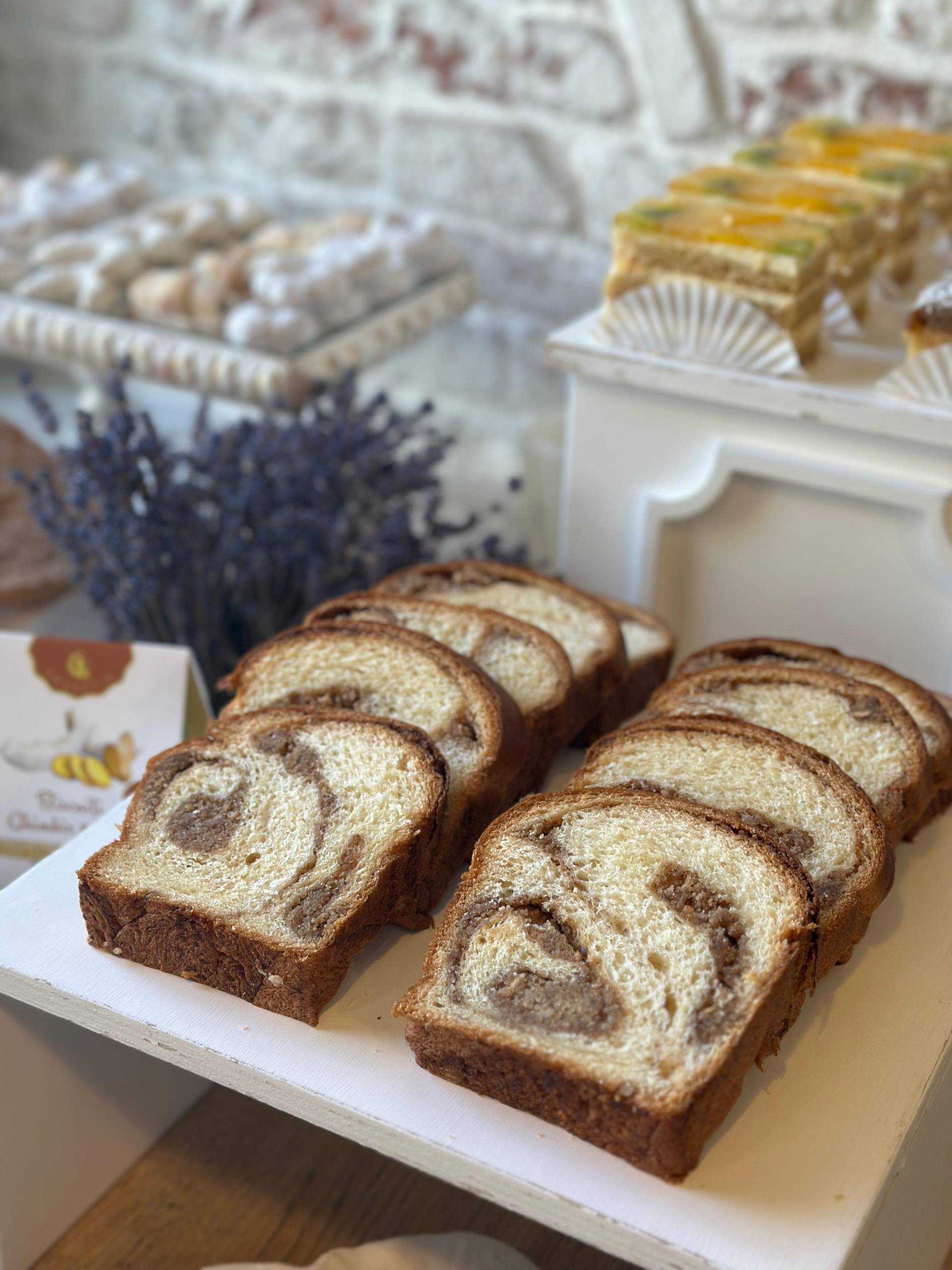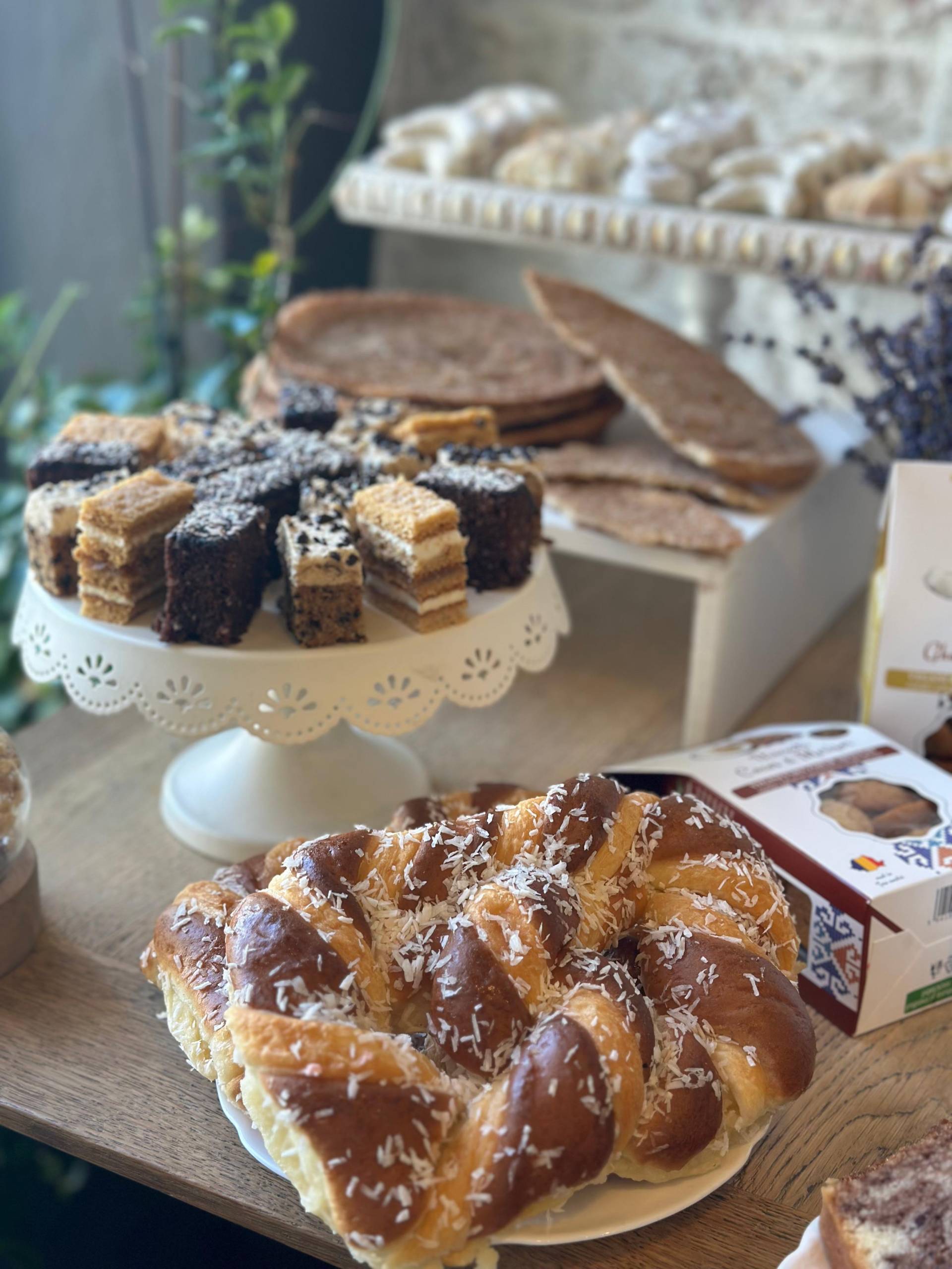 În vitrine vă așteaptă o mulțime de bunătăți, cum ar fi cornulețe cu nucă, cornulețe cu gem, inelușe , brioșe cu vișine, chec cu amarene, cozonac cu nucă sau cozonac cu cacao, stafide și rahat.
