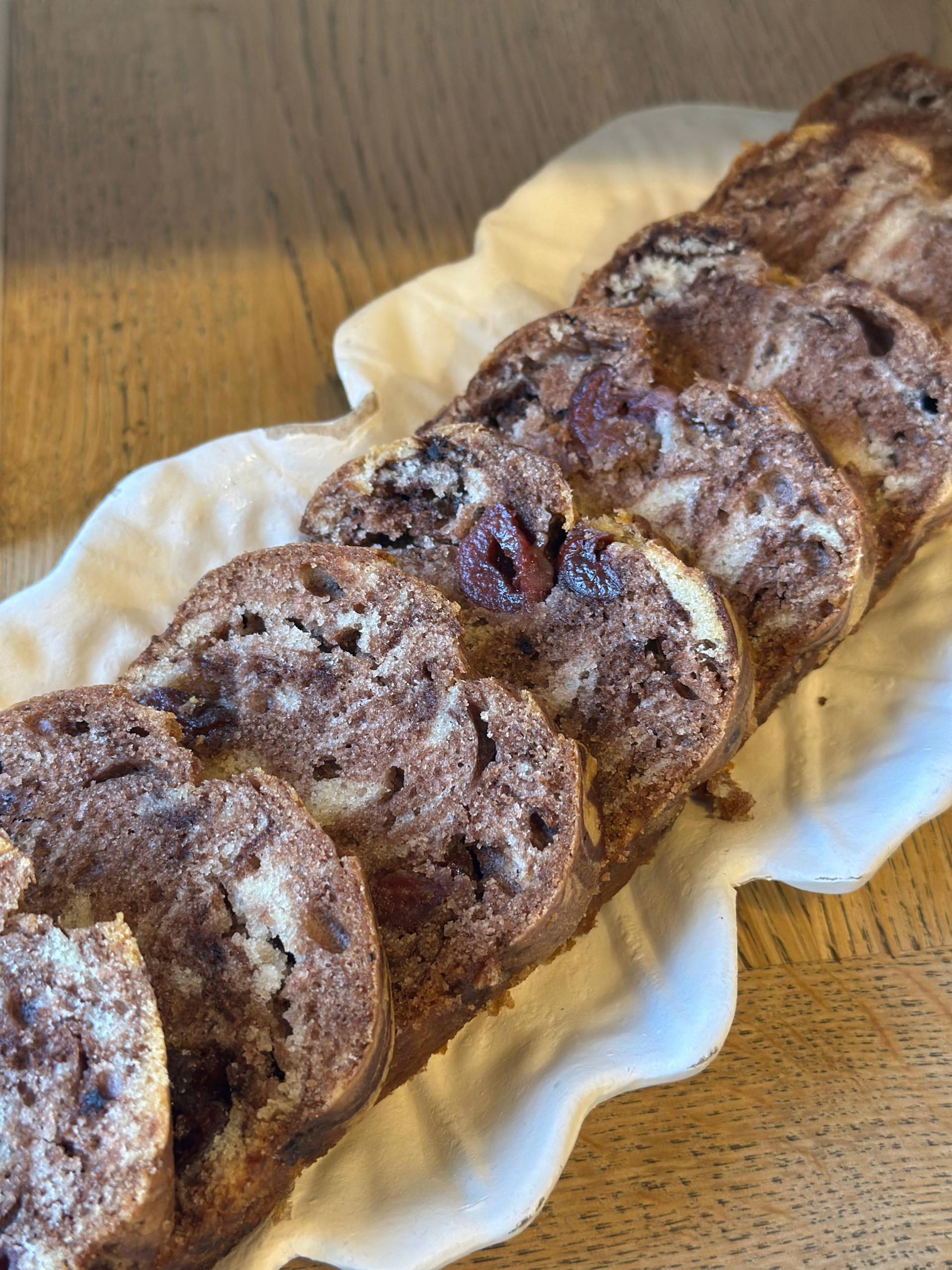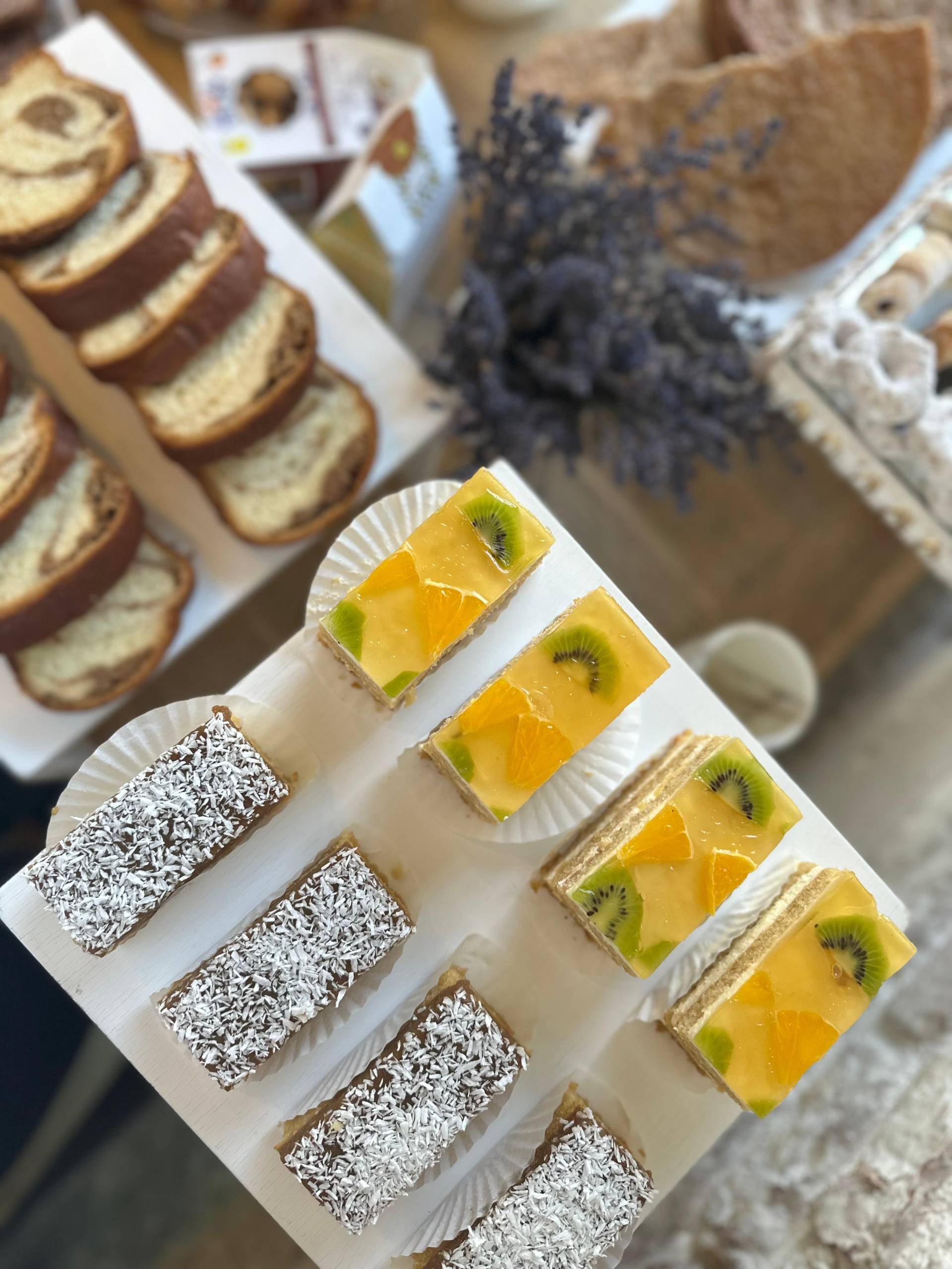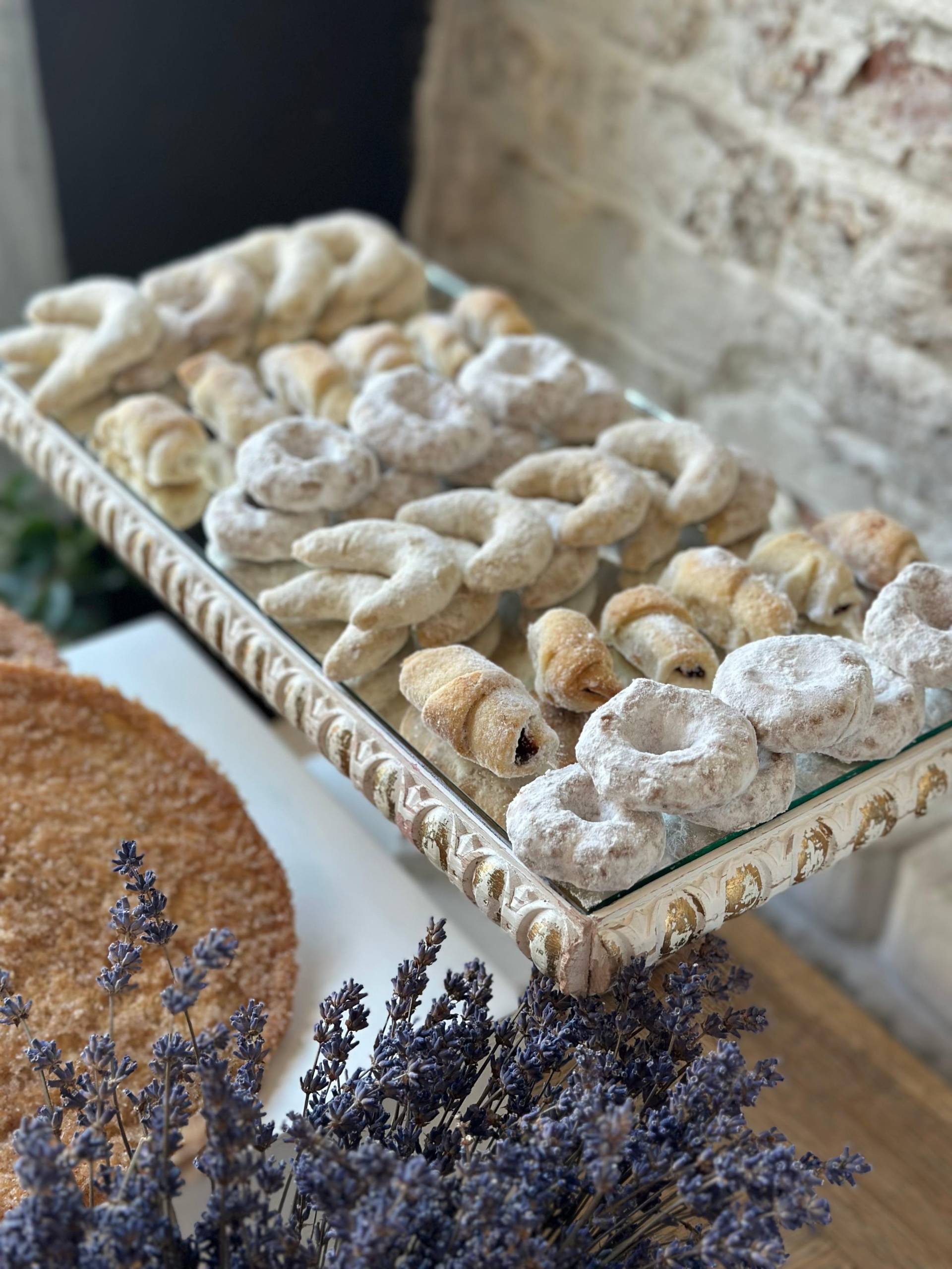 În vitrine vă așteaptă o mulțime de bunătăți, cum ar fi cornulețe cu nucă, cornulețe cu gem, inelușe , brioșe cu vișine, chec cu amarene, cozonac cu nucă sau cozonac cu cacao, stafide și rahat.