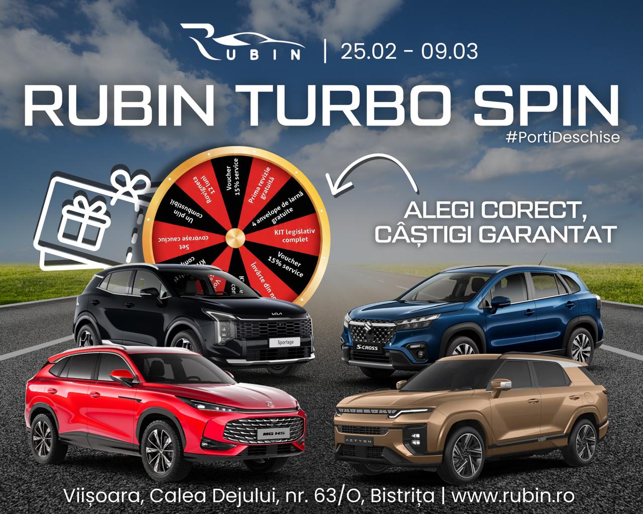 Rubin Motors îi așteaptă pe bistrițeni cu oferte de preț speciale la autoturisme și premii garantate la achiziționare, cu Rubin Turbo Spin. Cei care semnează un contract cu dealerul auto au șansa să învârtă roata norocului și merg acasă automat cu unul dintre premiile de pe roată.