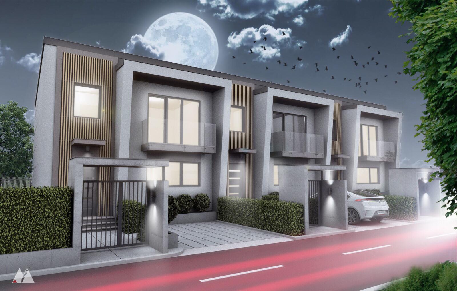 Este un ansamblu rezidențial cochet, compus din trei case înșiruite, un proiect arhitectural ingenios, gândit tocmai pentru a oferi Bistriței altceva. Casele au un teren cuprins între 220 și 296 metri pătrați, iar în funcție de poziția casei în ansamblu, terenul alocat este dispus în fața caselor și în spate, unde vor fi amenajate curțile interioare. Fiecare casă va avea în față două locuri de parcare pentru mașini, iar aleea de intrare în casă va fi realizată din dale de pavaj mare. Casele vor fi predate cu spații verzi amenajate cu gazon și plante decorative.