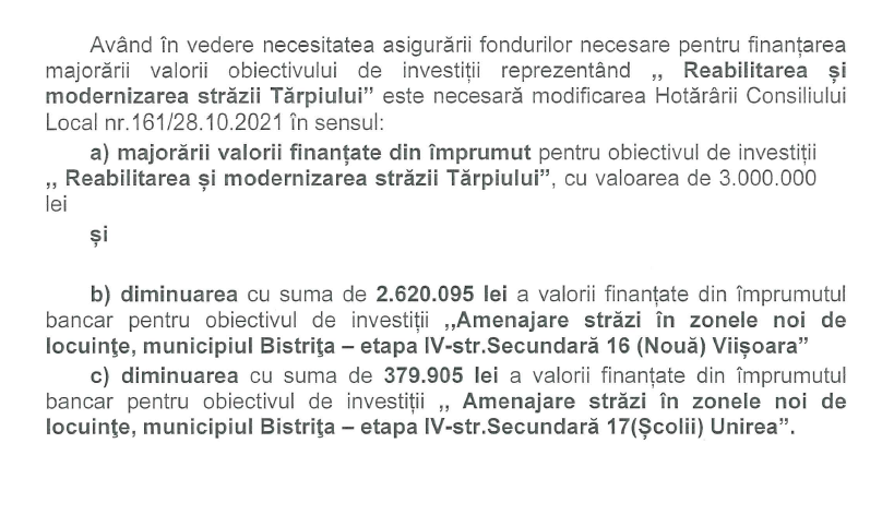 Conform proiectului aflat pe masa consilierilor, se renunță la alocarea banilor pentru străzile Secundară 16 din Viișoara și Secundară 17 din Unirea, pentru ca banii să fie folosiți pentru strada Tărpiului.