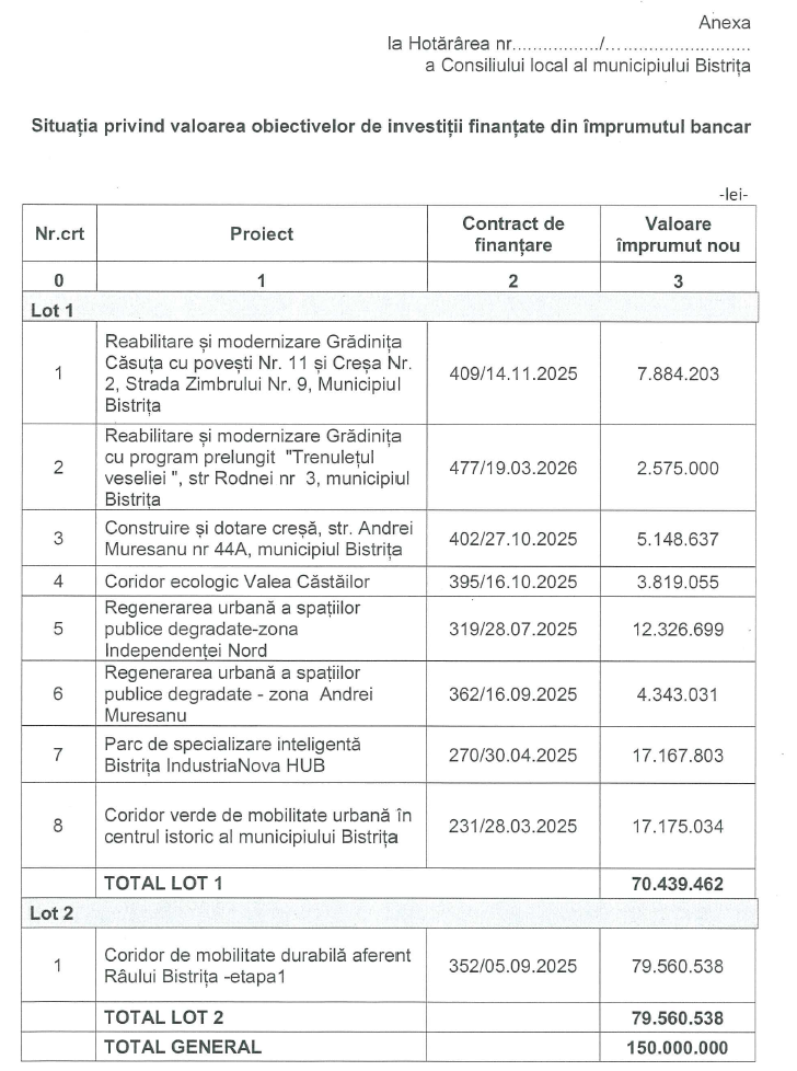 Un proiect de hotărâre va fi supus la vot consilierilor locali, joi. Mai exact, Primăria Bistrița vrea să contracteze unul sau mai multe împrumuturi, în valoare totală de 150 milioane de lei.