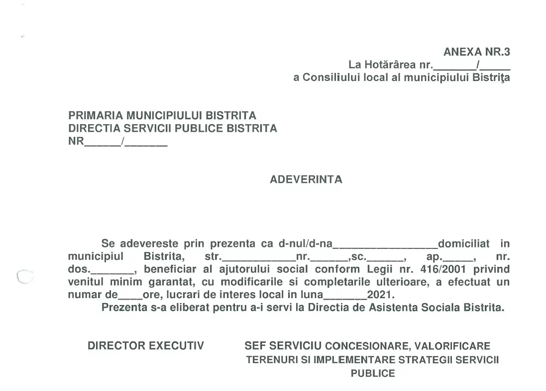 Astfel, se va face o situație lunară și se va emite o adeverință prin care se va atesta faptul că beneficiarul de ajutor financiar a ȘI prestat munca desemnată.
