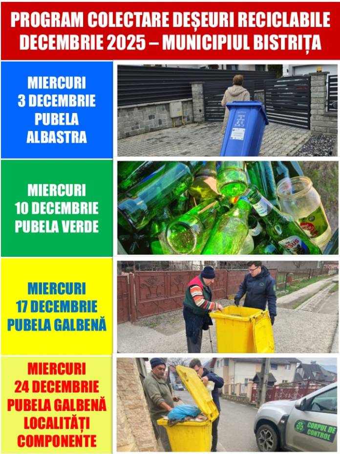 Programul de colectare a deșeurilor reciclabile în Bistrița și localitățile componente pentru luna DECEMBRIE 2025 este următorul: