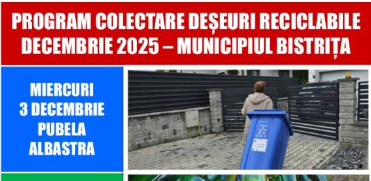 ADI Deșeuri BN a anunțat care este programul de colectare a deșeurilor reciclabile în Bistrița și localitățile componente pentru luna DECEMBRIE 2025.