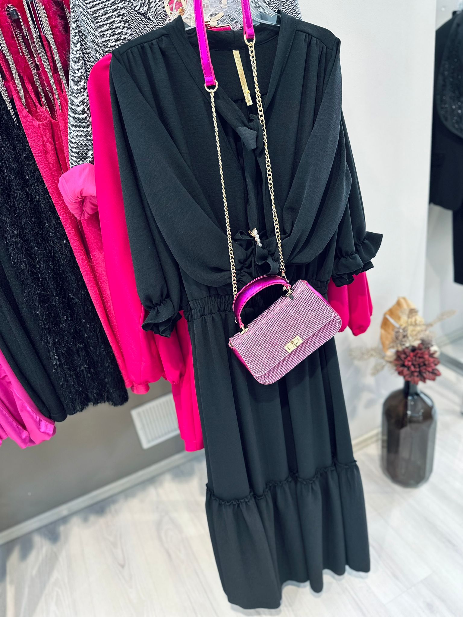 O rochie neagră simplă poate fi scoasă în evidență cu o gentuță roz, albastră sau galbenă.