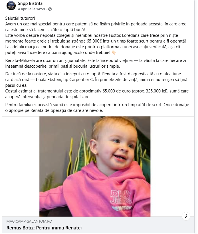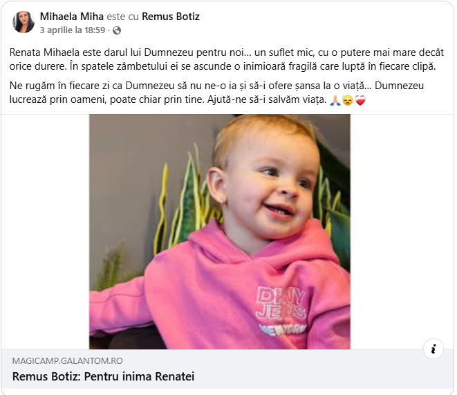 Povestea Renatei și link pentru donații găsiți și pe pagina Pentru inima Renatei