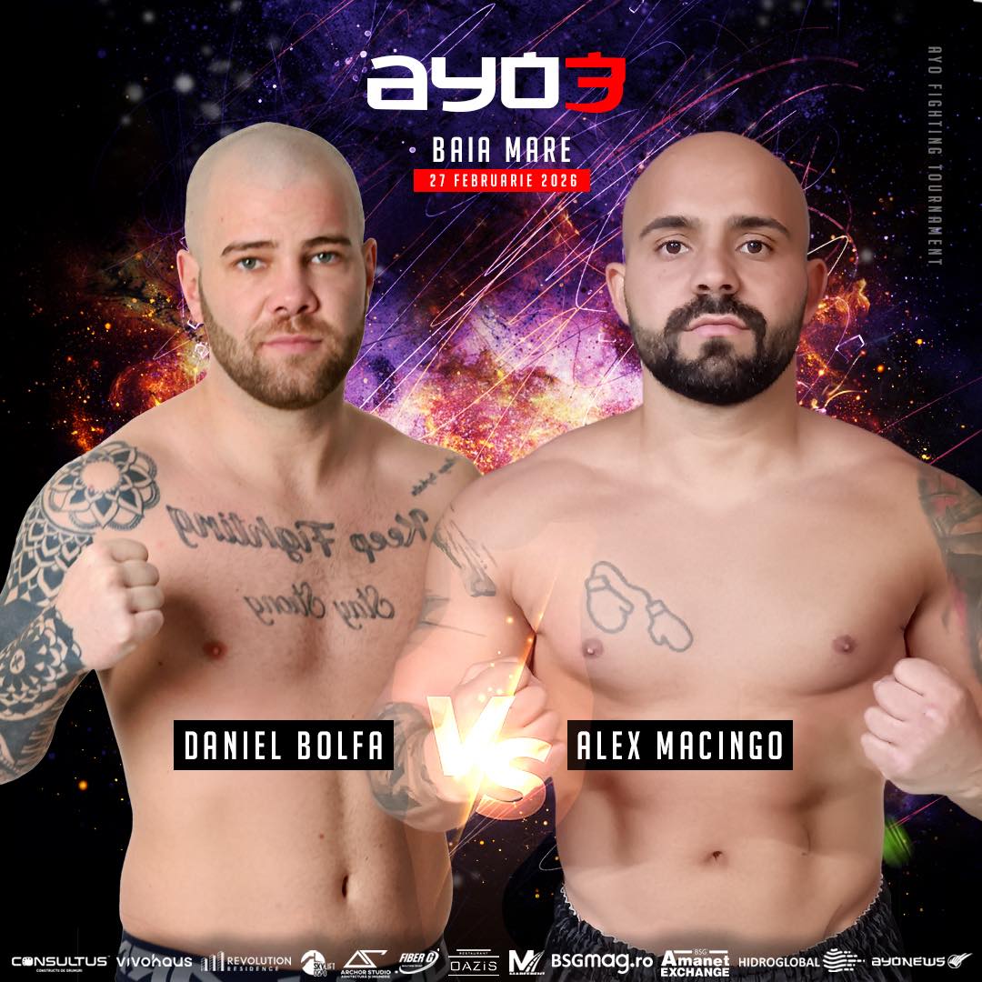 ”Am promis un meci inedit la AYO 3. Ne ținem de cuvânt. Puncher vs Puncher. Alex Macingo vs Daniel Bolfa. Box cu mănuși de MMA. Două stiluri agresive. Două mâini grele. Un singur deznodământ posibil. Cine va cădea primul?” au transmis organizatorii AYO 3.