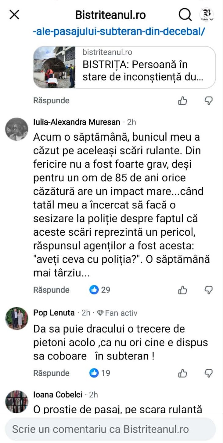 O bistrițeancă a precizat, pe Facebook, într-un comentariu, că, în urmă cu o săptămână, și bunicul său a căzut pe scările în cauză, însă din fericire, nu a fost grav rănit.