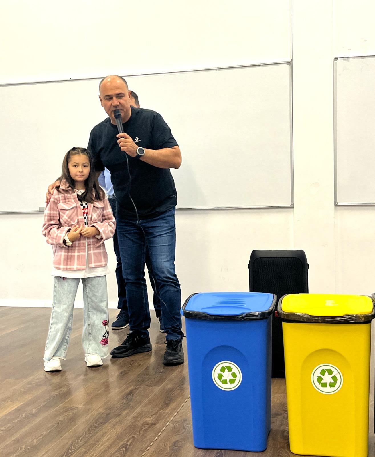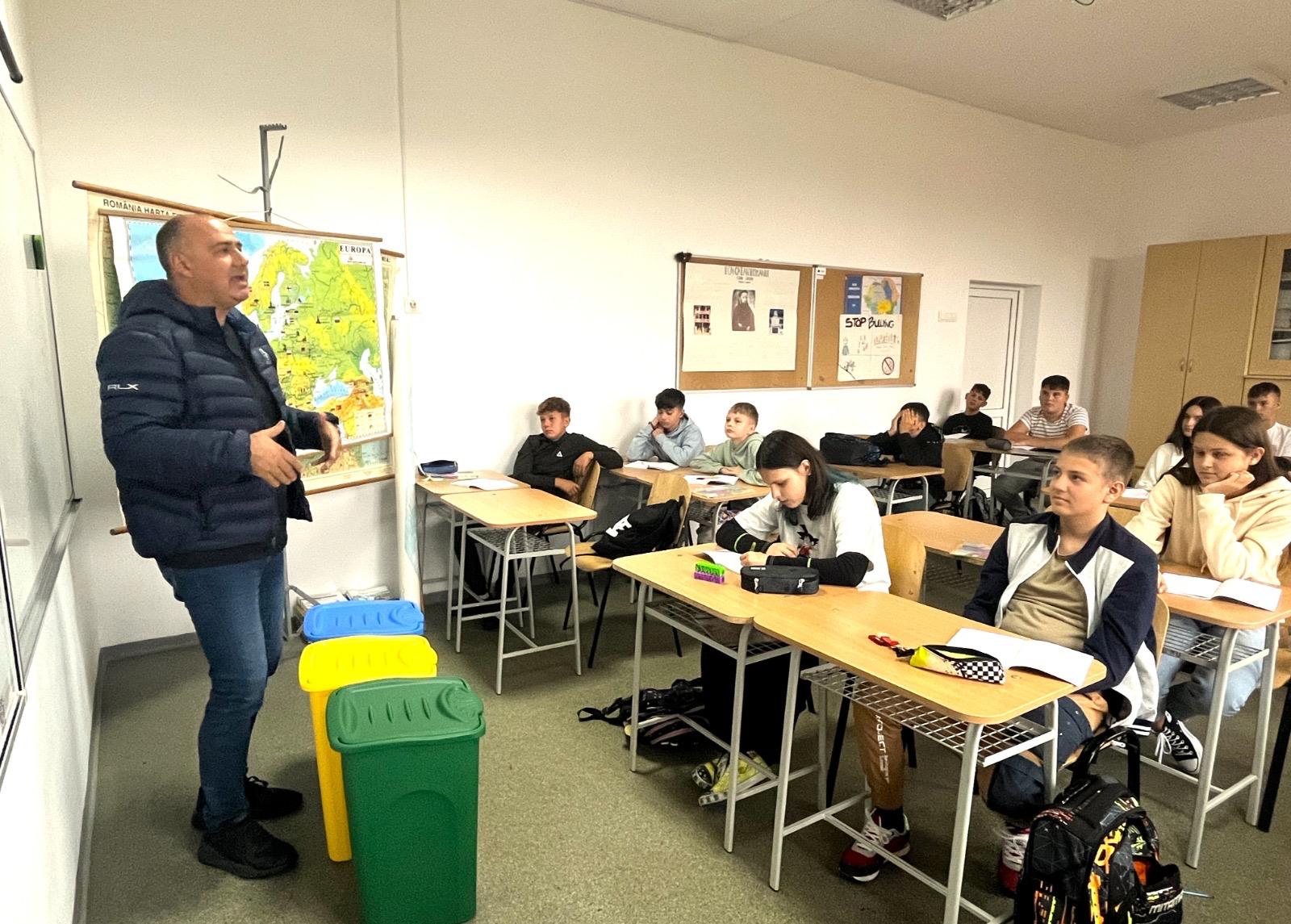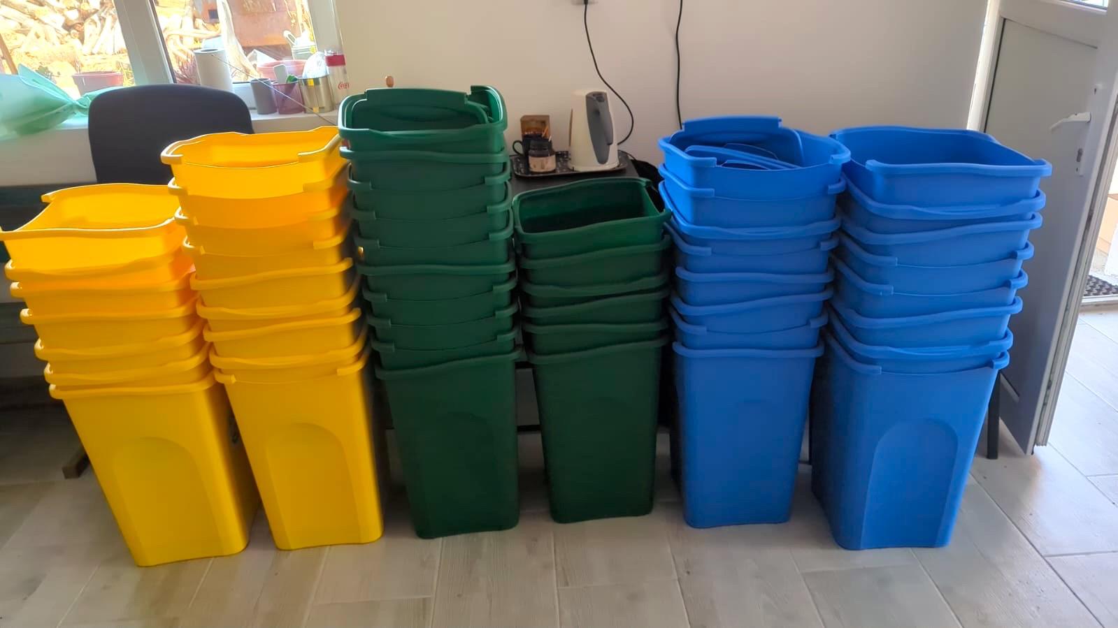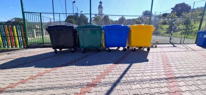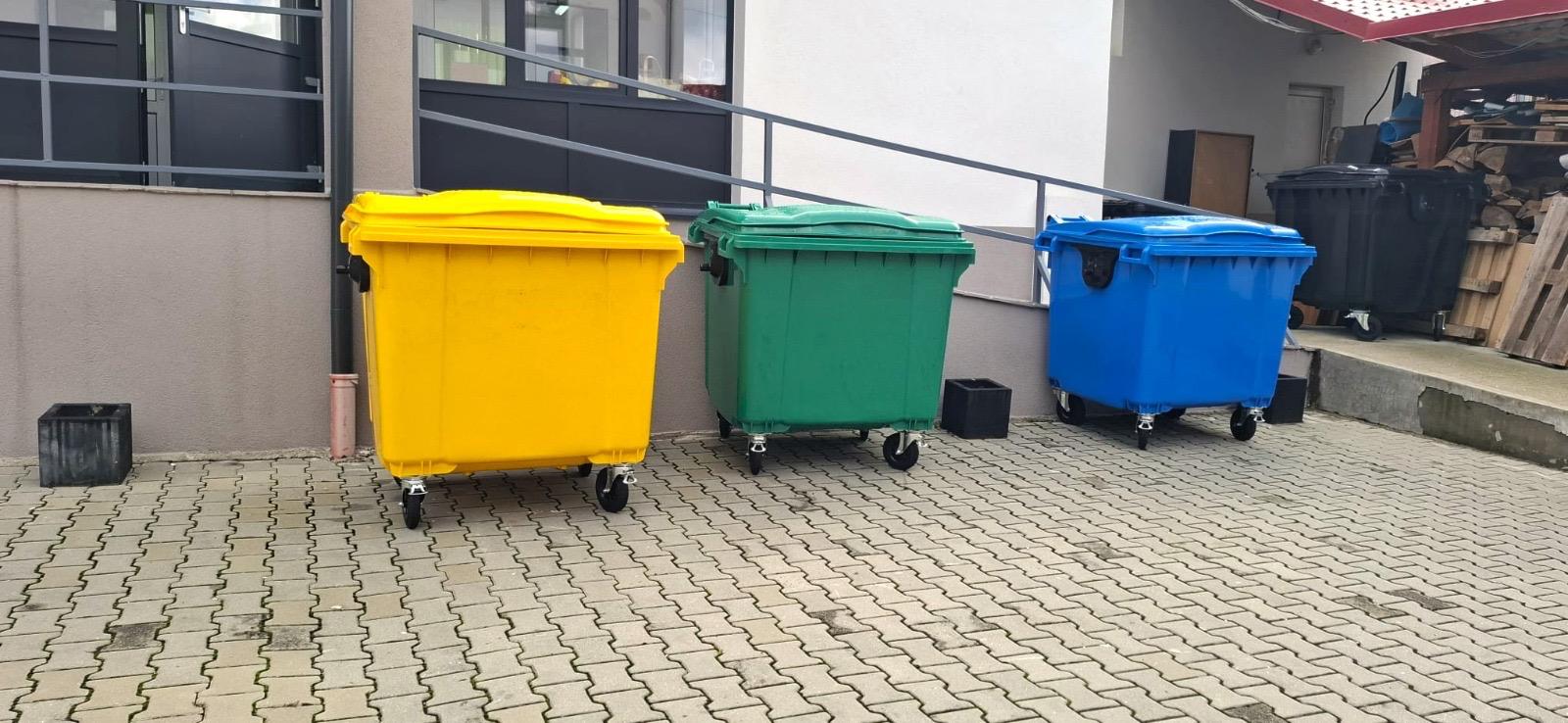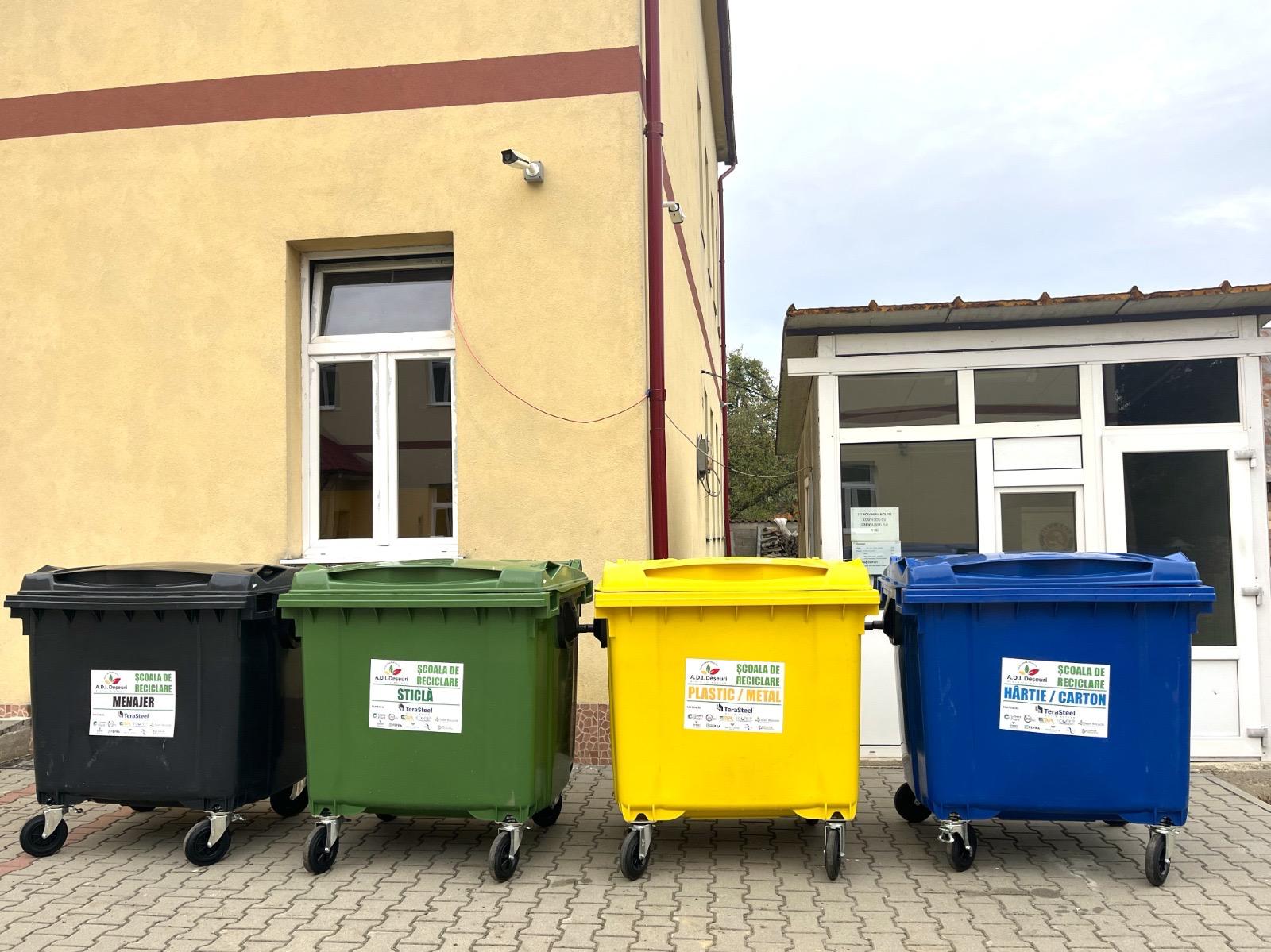Pubelele colorate, de 50 L, pentru deșeurile reciclabile din plastic / metal, hârtie / carton și sticlă, vor fi plasate în sălile de cursuri care deservesc ciclurile primare și gimnaziale.