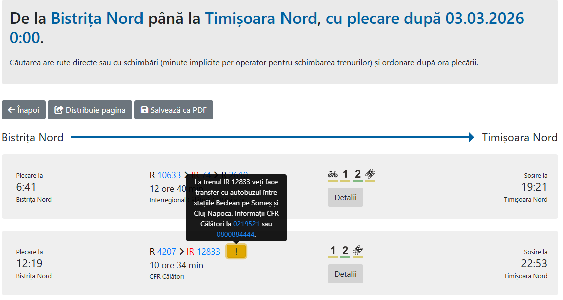 • În perioada 1 martie – 25 aprilie 2026, trenul IR 1830 Galați–Cluj Napoca va circula conform graficului de circulaţie în relaţia Galaţi – Beclean pe Someş şi va fi anulat în relaţia Beclean pe Someş – Cluj Napoca. Între staţiile Beclean pe Someş şi Cluj Napoca se va asigura transportul călătorilor cu mijloace auto.