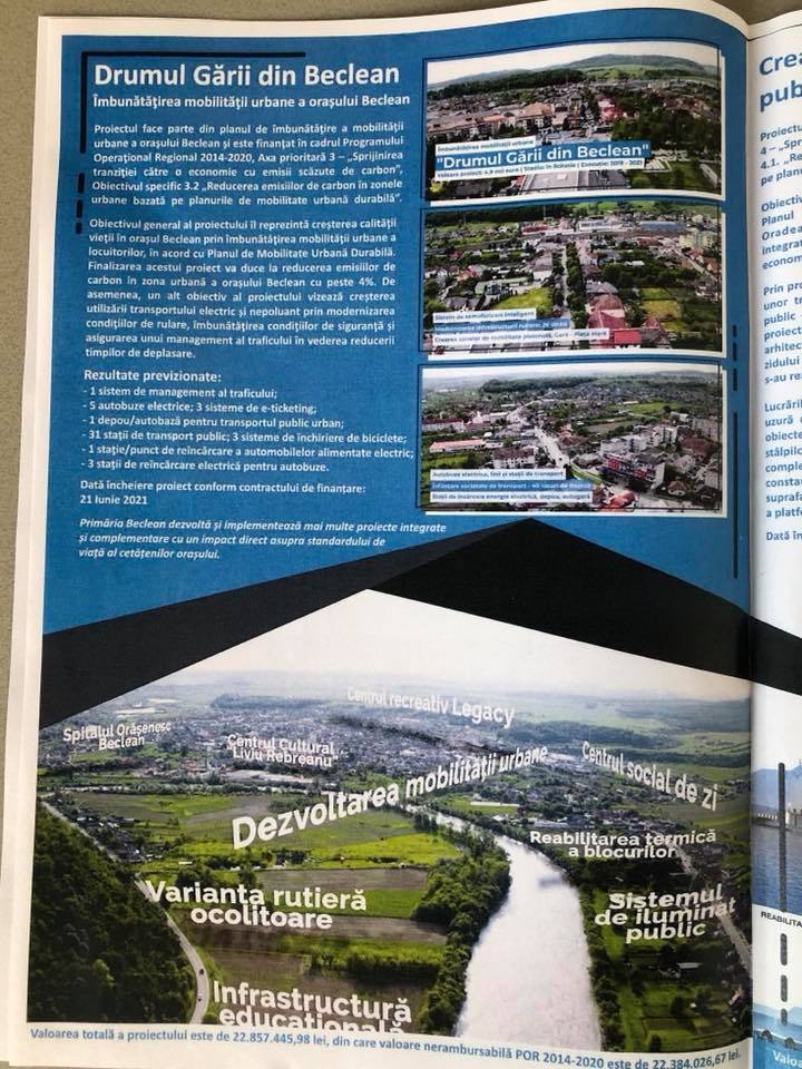 „Suntem onorați de faptul că ADR Nord – Vest a inclus Becleanul în prestigioasa revistă Regio, care prezintă cele mai importante proiecte cu fonduri europene obținute în ultimul an de zile la nivel regional. De asemenea, apărem în pliantul INFO POR 2020 cu proiectul «Drumul Gării din Beclean», care va fi distribuit la scară largă”, anunță primarul Becleanului, Nicu Moldovan, pe pagina sa de Facebook.