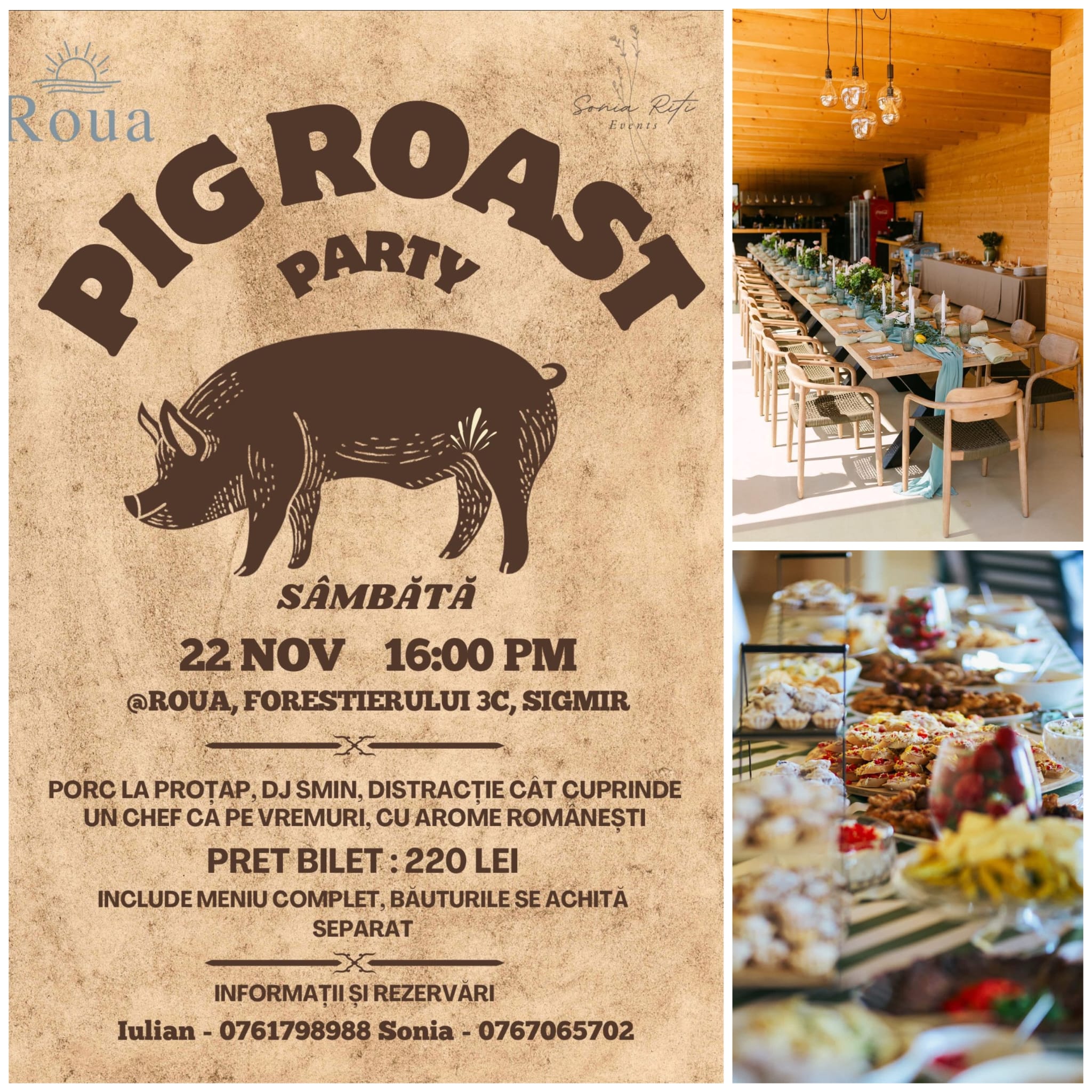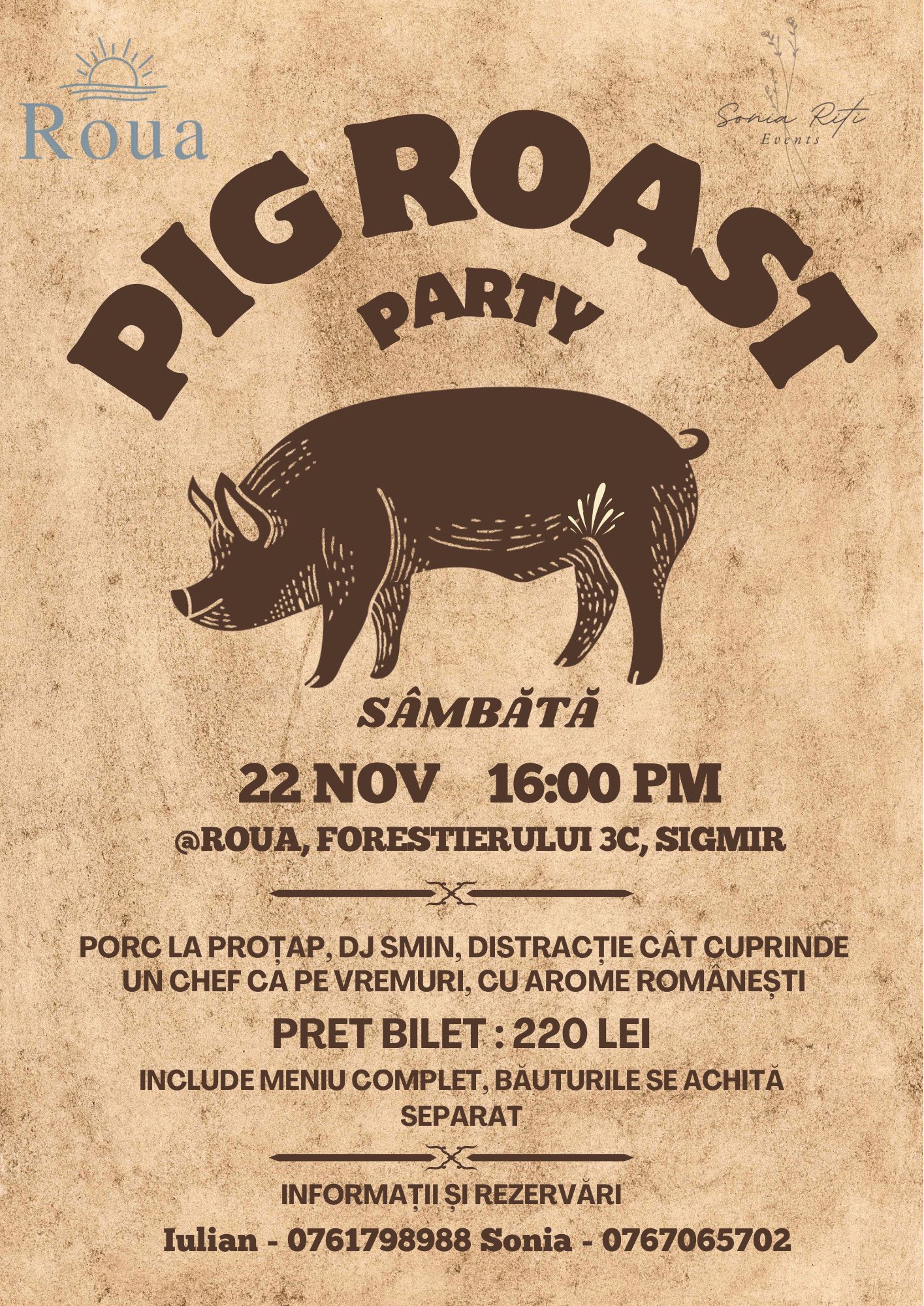 După alte evenimente memorabile organizate deja aici, ROUA Bistrița, deschisă vara aceasta pe strada Forestierului 3C din Sigmir, dă startul petrecerilor de toamnă cu un autentic Pig Roast Party! Sâmbăta viitoare, 22 noiembrie, sunteți așteptați la cea mai gustoasă petrecere a sezonului, cu miros de foc, vin fiert, porc rumen la proțap și chef până târziu, în noapte. PONT: Locurile sunt limitate, așa că e musai să vă faceți rezervare din timp!