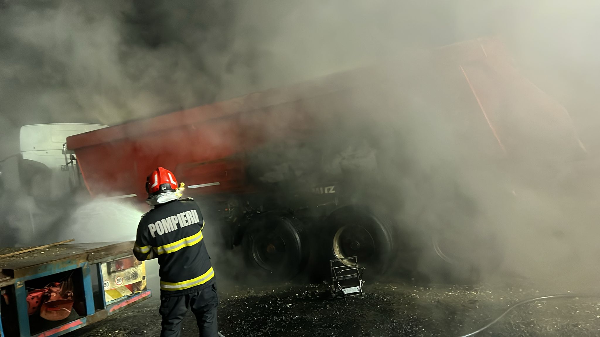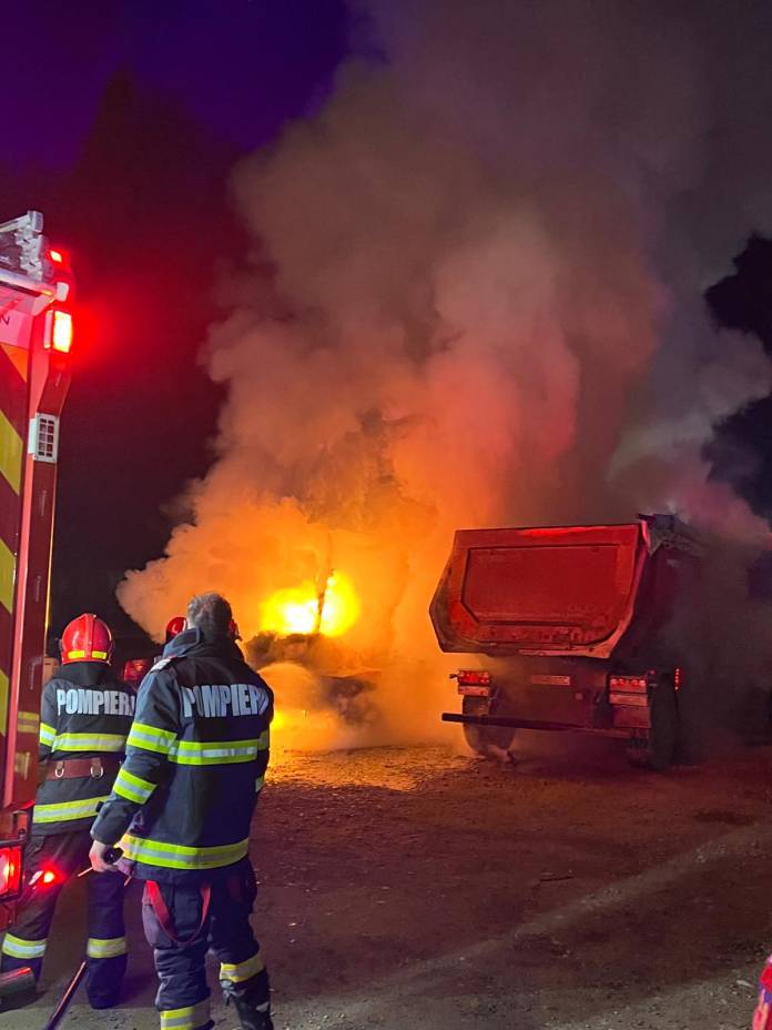 „Incendiul a fost lichidat. Acesta s-a manifestat la un dumper de 6 tone, care ardea generalizat la momentul sosirii echipajelor, și au fost afectate anvelopele unui autocamion (16 tone) parcat în apropiere. Pompierii au reușit să stingă incendiul și să protejeze camionul”, precizează reprezentanții ISU Bistrița.