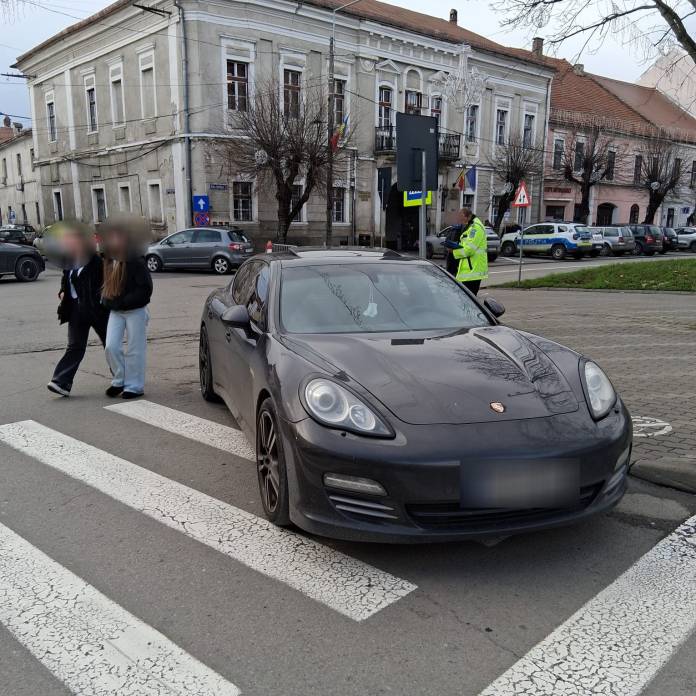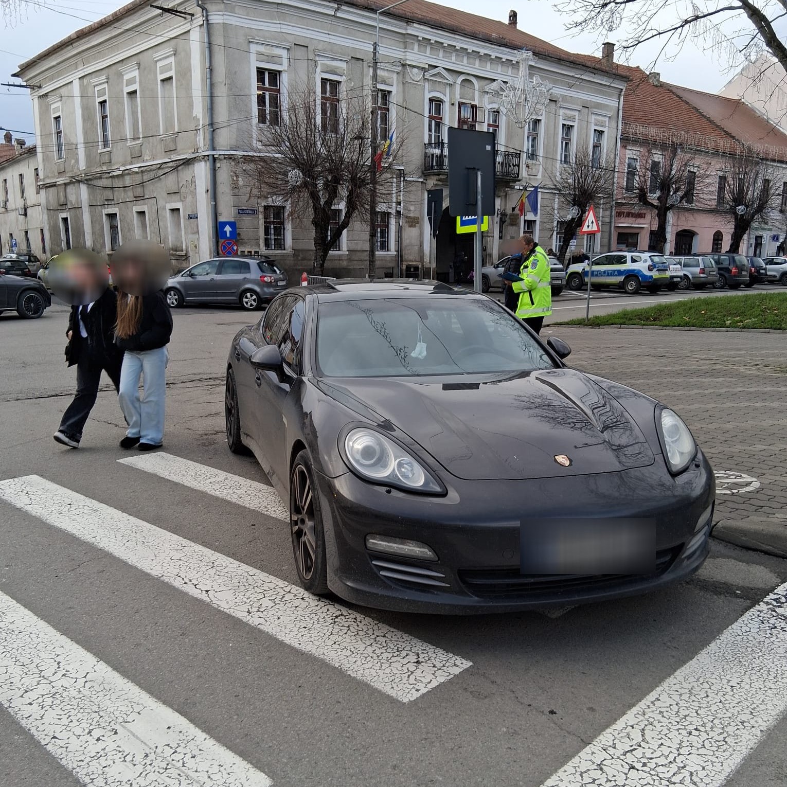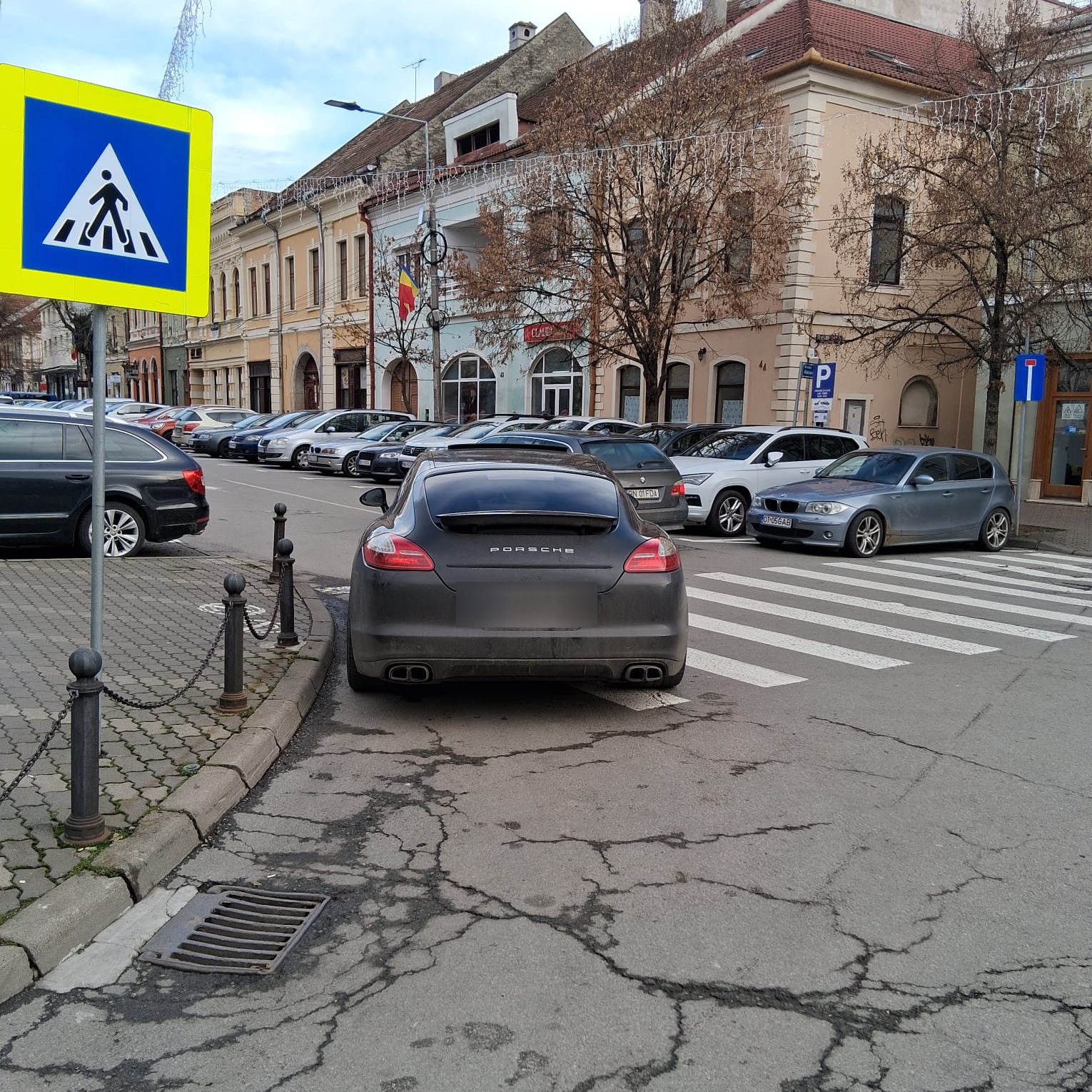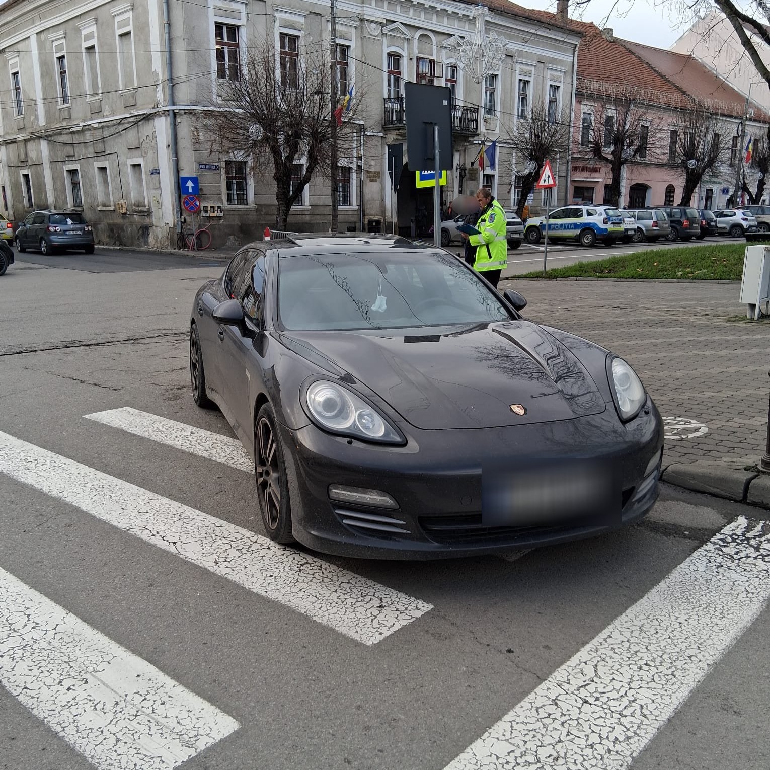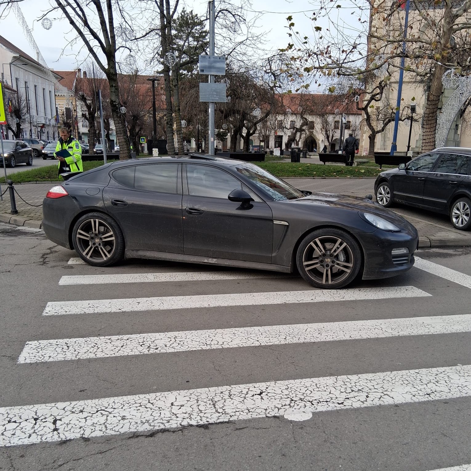 Un șofer a fost amendat cu 810 lei de către Poliția Locală după ce și-a lăsat Porsche-ul pe trecerea de pietoni, în zona Primăriei Bistrița.