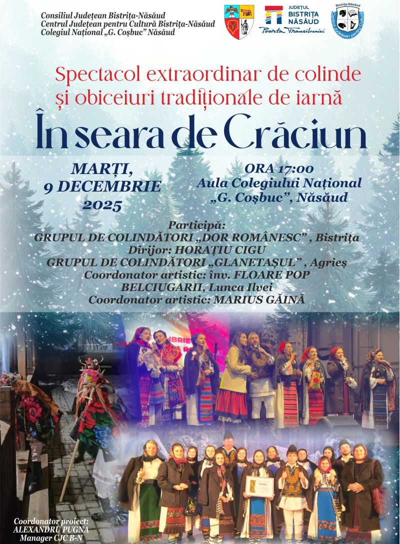 Marți, 9 decembrie 2025, de la ora 17.00, în aula Colegiului Național George Coșbuc din Năsăud are loc spectacolul extraordinar „În seara de Crăciun”.