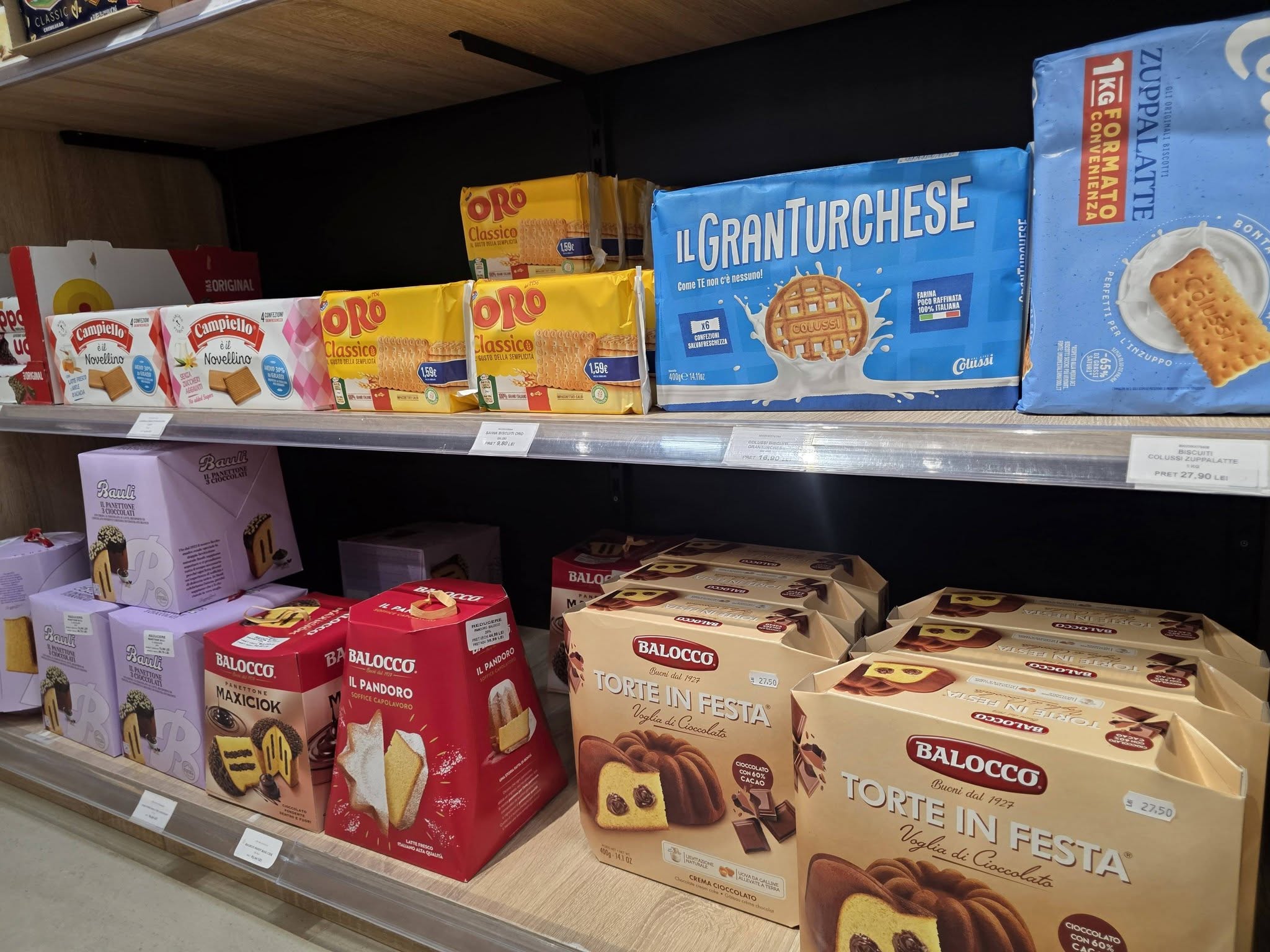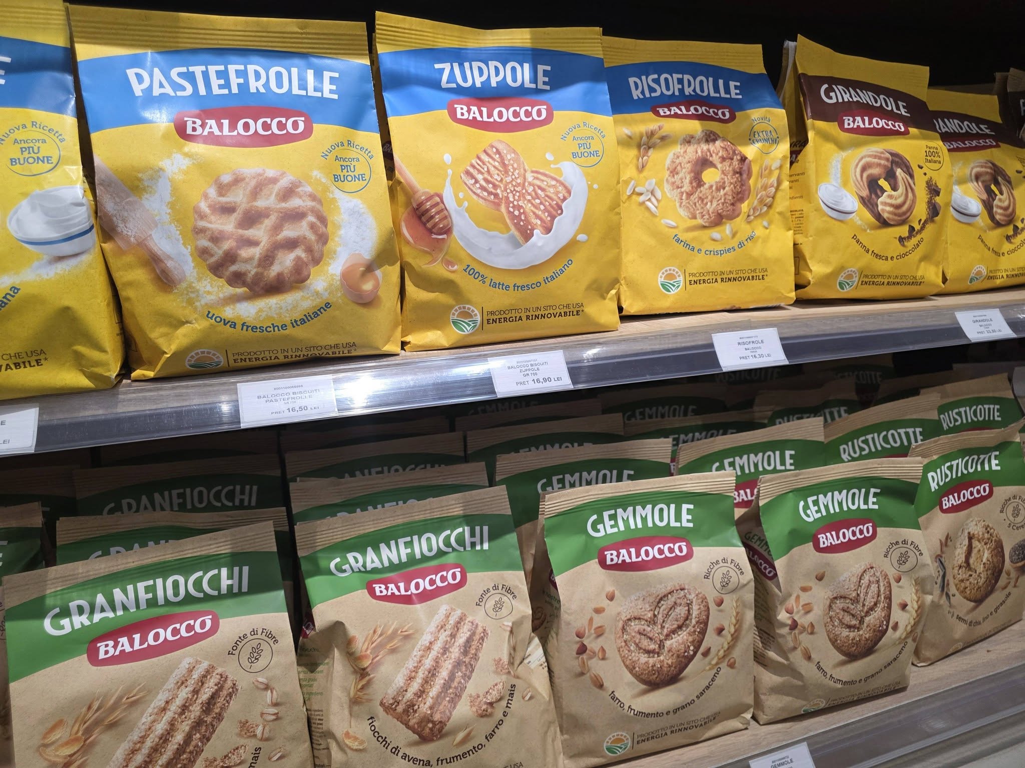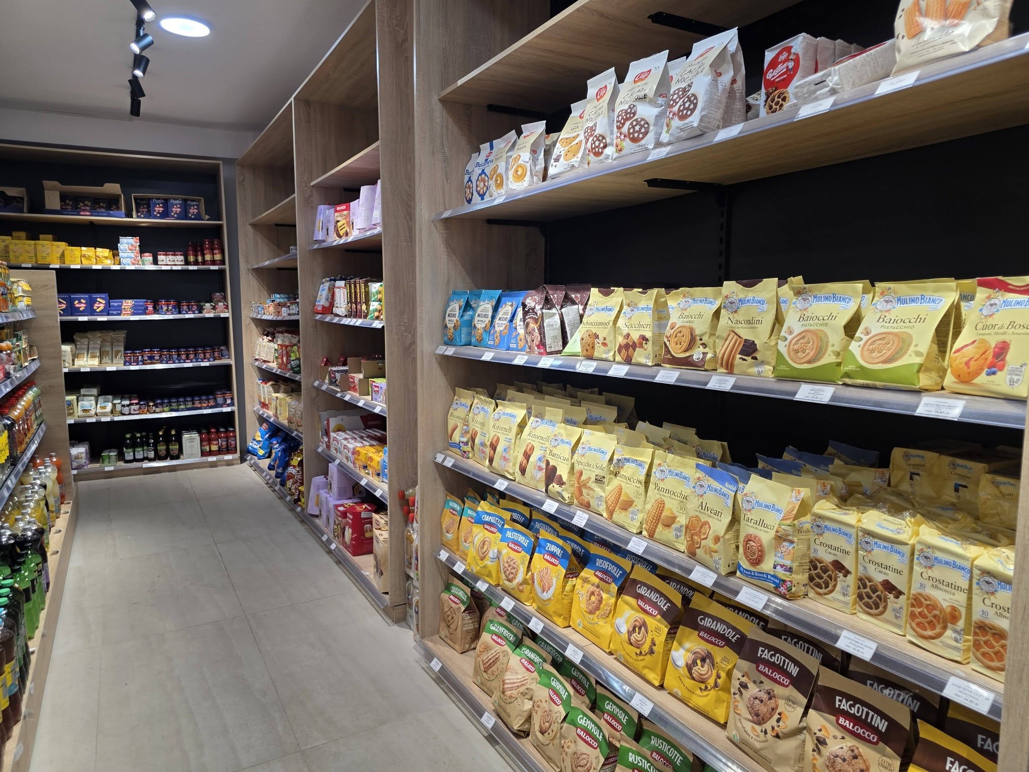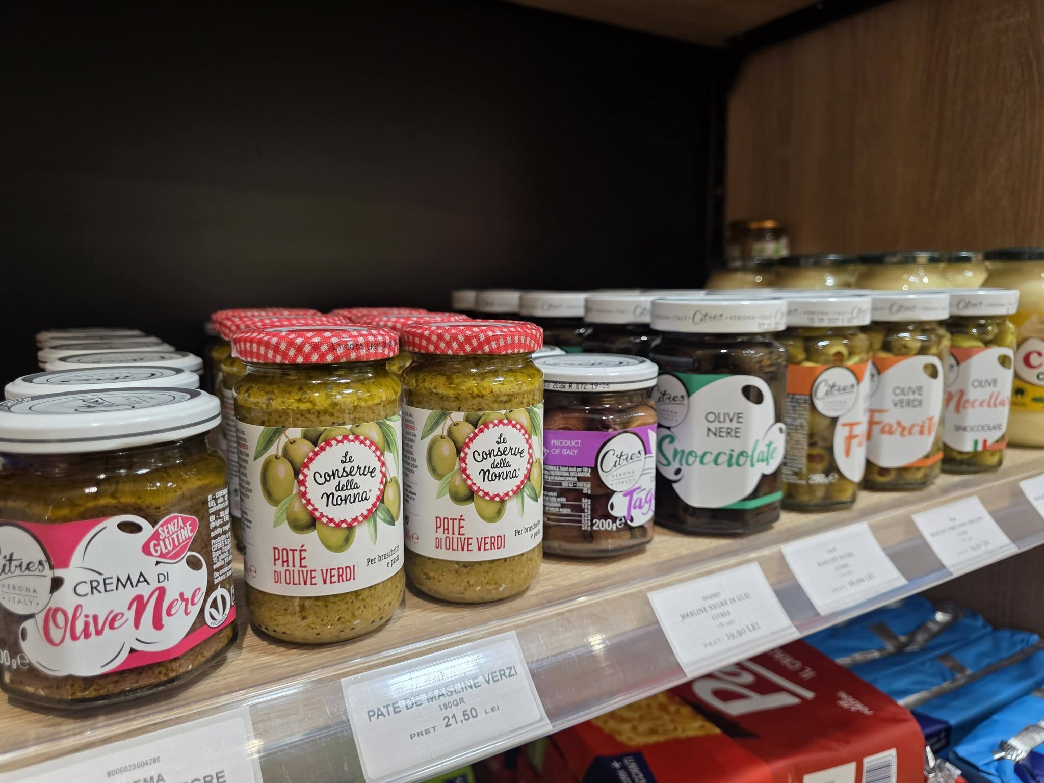 Bineînțeles, nu lipsesc ​deliciile fabricate în Italia: paste Barilla, sosuri autentice, pesto cu ardei, cu ton sau rustic, ulei de măsline, roșii uscate simple sau cu capere, gnocchi, făină pentru aluat de pizza, măsline, pate de măsline verzi, chipsurile sau biscuiții sărați.