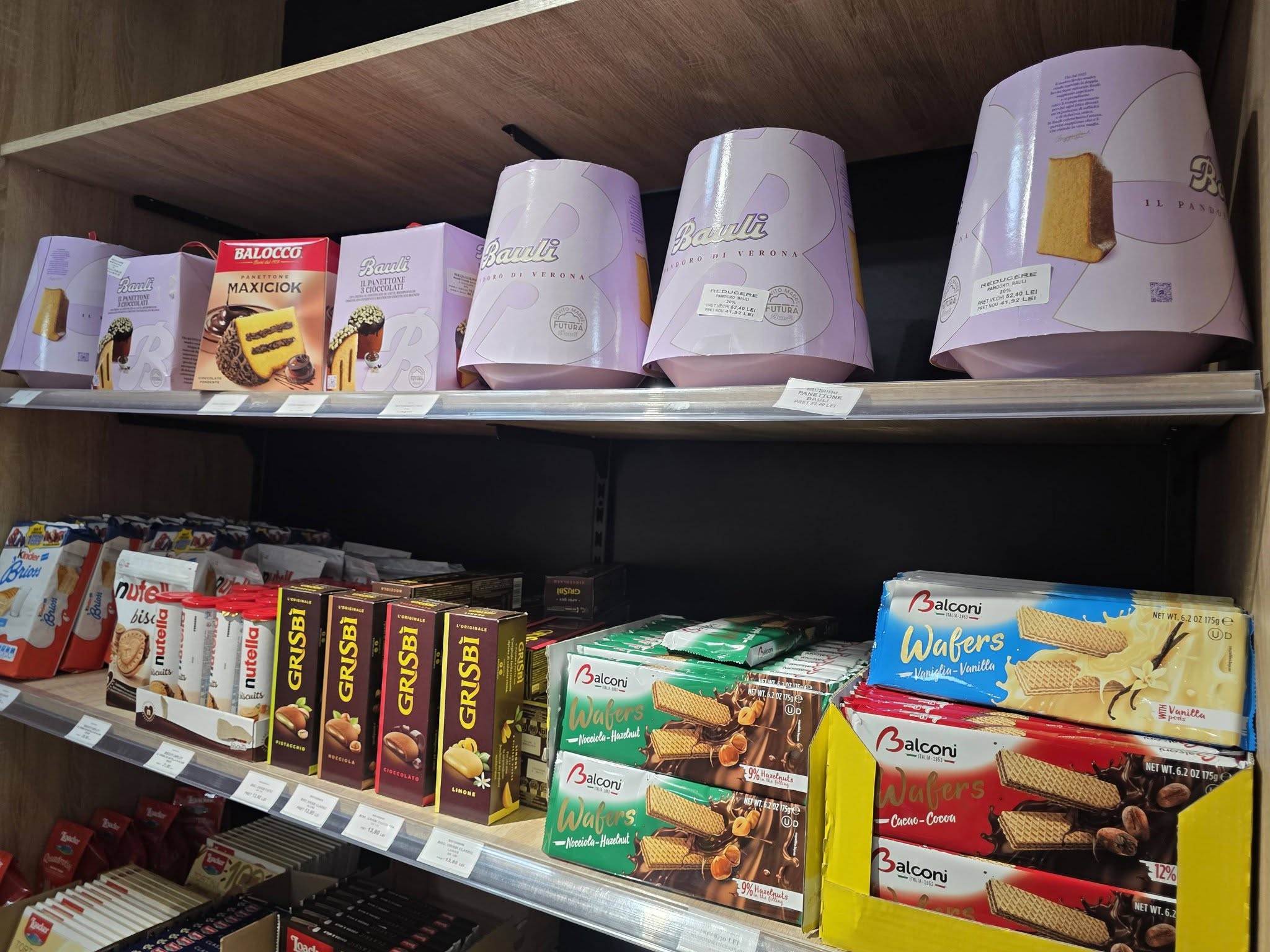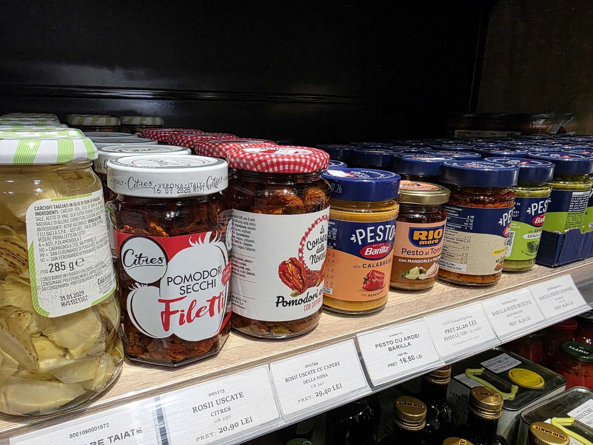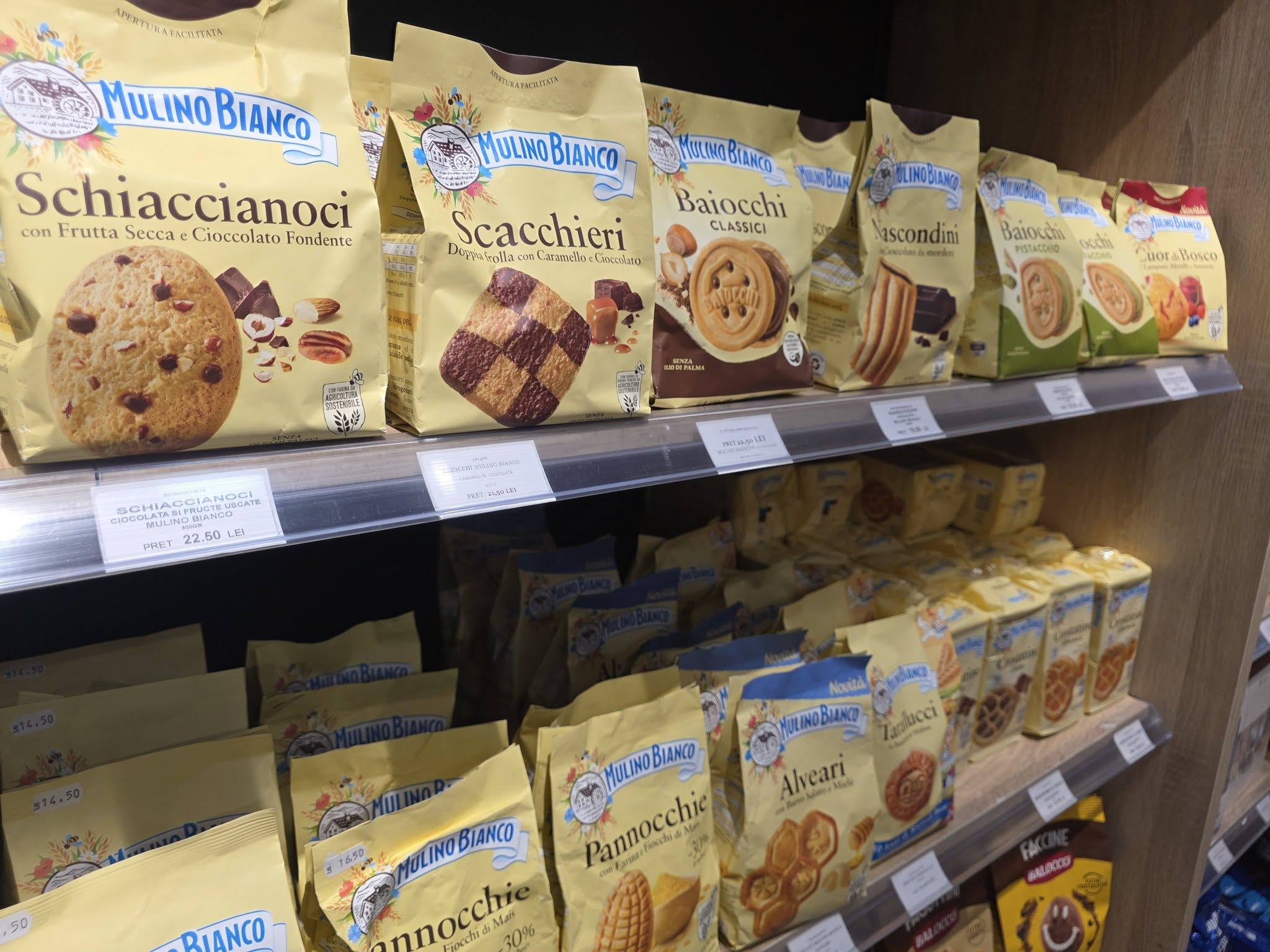 Bineînțeles, nu lipsesc ​deliciile fabricate în Italia: paste Barilla, sosuri autentice, pesto cu ardei, cu ton sau rustic, ulei de măsline, roșii uscate simple sau cu capere, gnocchi, făină pentru aluat de pizza, măsline, pate de măsline verzi, chipsurile sau biscuiții sărați.