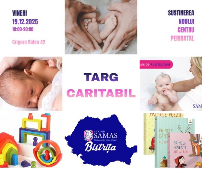 Școala Mamei SAMAS Bistrița, prin Monica Ungur, organizează vinerea viitoare un târg caritabil pentru dotarea noului Centru Perinatal Samas Bistrița. Acesta va funcționa în aceeași clădire cu Școala Mamei SAMAS, de pe Bulevardul General Grigore Bălan, și va avea medic pediatru, psiholog, kinetoterapeut pediatru, IBCLC, chiar și profesor de Limba Engleză pentru cadrele medicale.