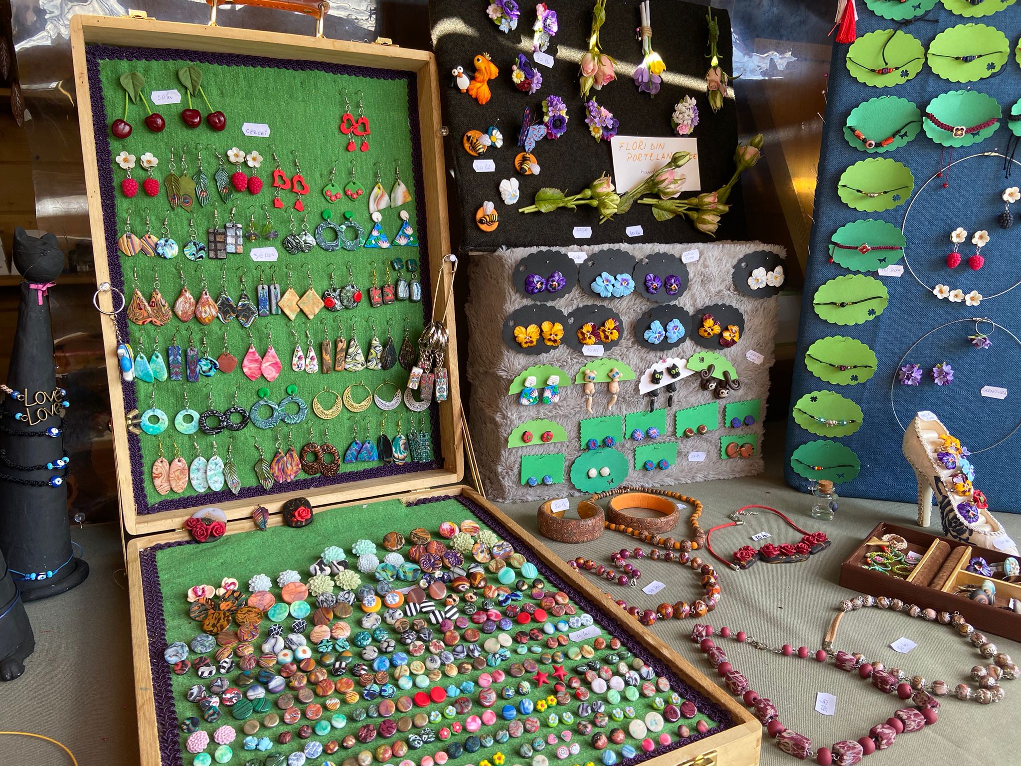 Căsuța doamnei Silvia Varga se cunoaște de la distanță. Pictorița a creat special pentru cei care vor să facă un cadou frumos ori să păstreze decorațiunile pentru ei o sumedenie de obiecte artistice. Sunt prezenți cercei de cermică, prinzătoare de vise, brățări, sticle împodobite cu lut, chiar și materiale brodate.
