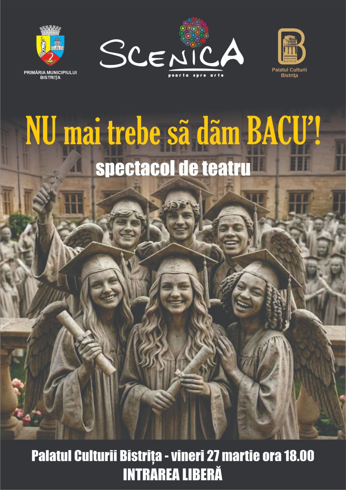 Nu mai trebe să dăm BACU’ – spectacolul cu adolescenți și tineri de la SCENICA – promite să ne dezvăluie crâmpeie din „lumi exterioare și interioare. Societate-familie-tânăr. Viața de altădată, de acum și… de apoi. Reală și imaginară, cu moșteniri-presiuni-mode, în poveste-poezie-dans…