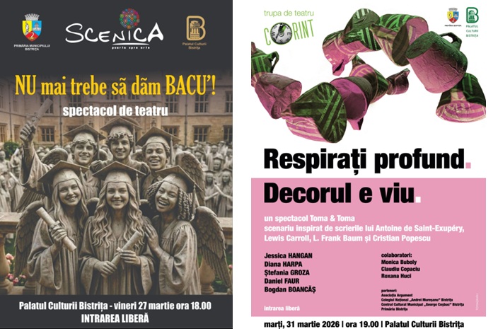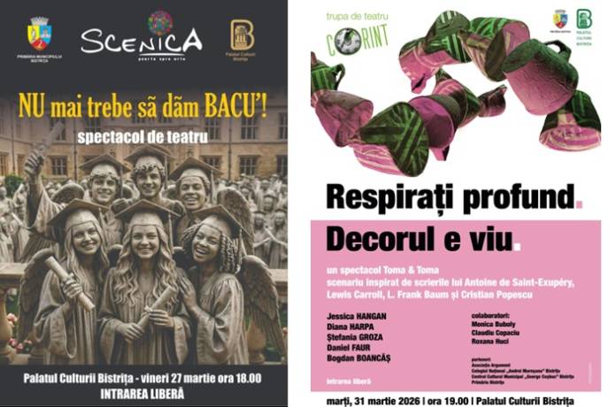 Ne așteaptă două spectacole extraordinare de teatru, la Palatul Culturii din Bistrița. Primul dintre ele – mâine, 27 martie, chiar de ziua internațională a teatrului, cu liceenii de la Scenica. Spectacolul Corint are loc marți, 31 martie. Intrarea este liberă.