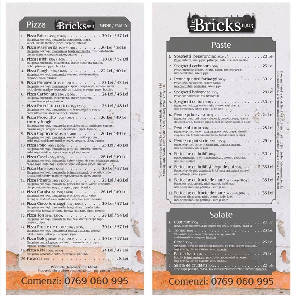Așadar, în galleria foto de mai jos sau pe pagina de Facebook – The Bricks 1903 găsiți meniul berăriei, iar dacă dați un Like rămâneți la curent cu toate evenimentele și ofertele lor, iar cu un telefon la 0769 060 995 puteți comanda și afla în cât timp poate ajunge la voi comanda.