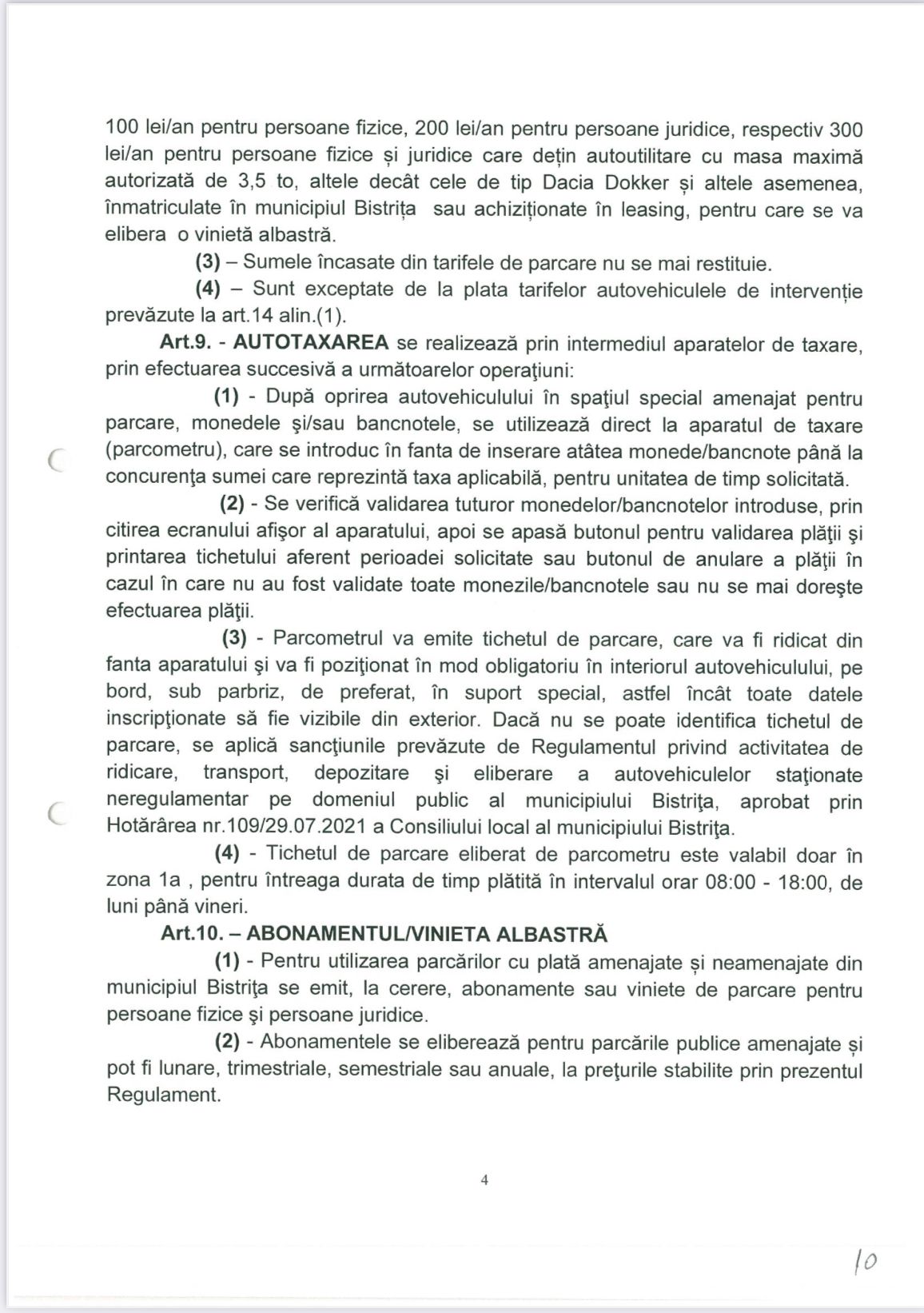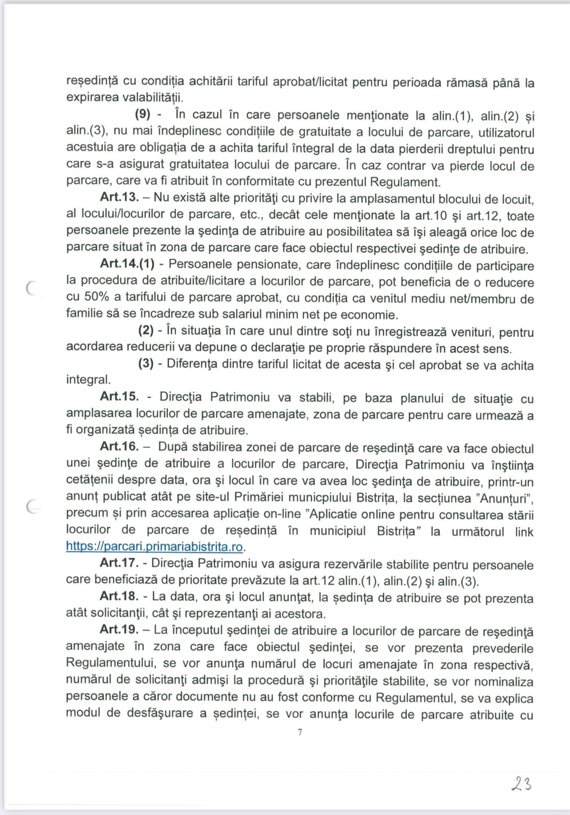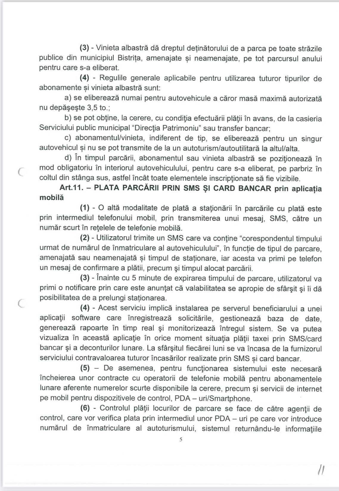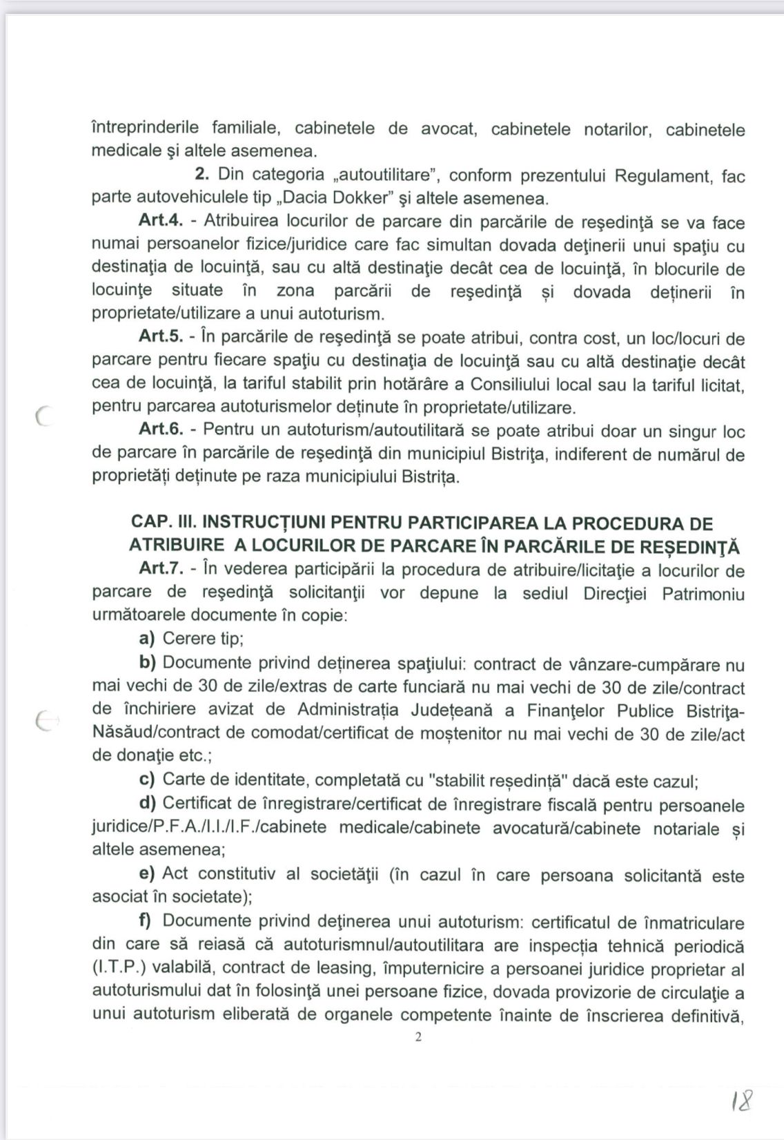„Vinieta dă dreptul deținătorului de a parca pe toate străzile publice din municipiul Bistrița, amenajate și neamenajate, pe tot parcursul anului pentru care s-a eliberat. Vinieta nu se poate transmite de la un autoturism/autoutilitară la altul/alta și obligatoriu se va lipi în interiorul autovehiculului în colțul stânga sus, la loc vizibil. Persoanele care dețin o parcare de reședință vor beneficia cu titlu gratuit de vinieta albastră care va avea aceeași valabilitate ca și parcarea de reședință și se va elibera la data plății tarifului parcării de reședință pentru perioada următoare”, se arată în regulamentul parcărilor.