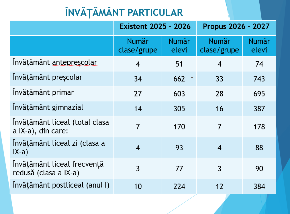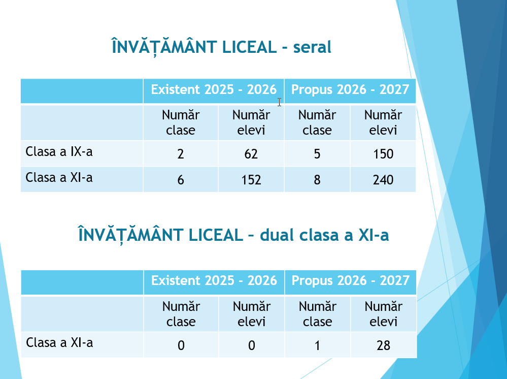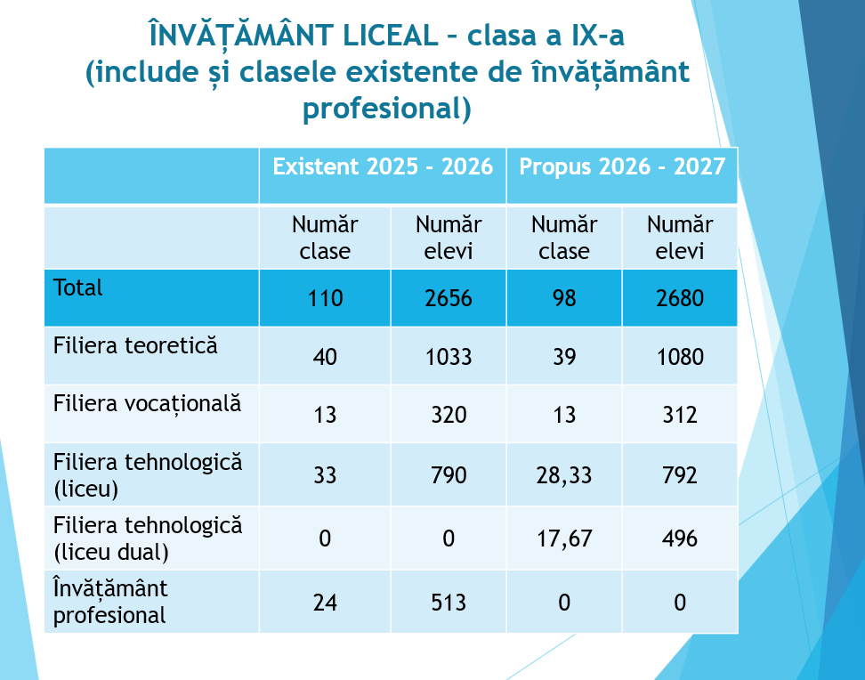 Există și excepții. La nivel de liceu crește numărul de clase de la 324 la 353, datorită faptului că și numărul de elevi crește de la 8.124 la 9.028.