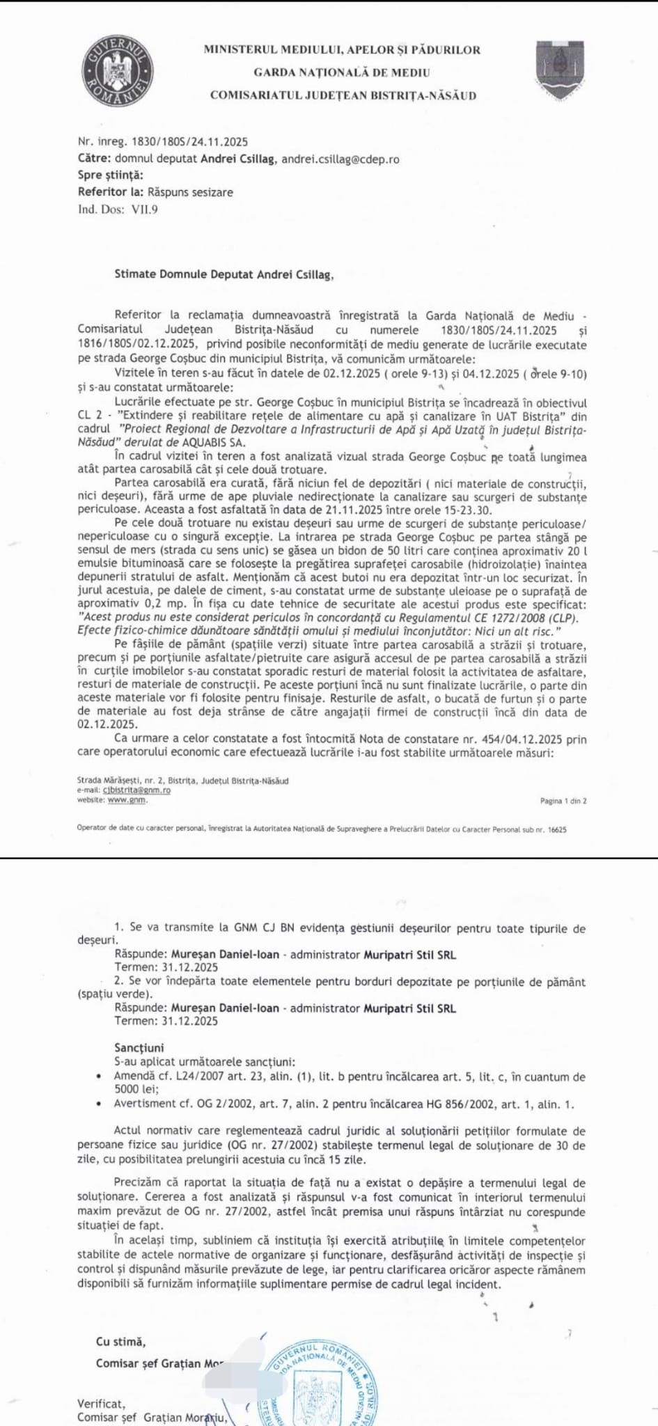 Inspectorii Gărzii de Mediu au verificat starea străzii George Coșbuc, din centrul istori al Bistriței, care a fost asfaltată în 21 noiembrie, în urma unei sesizări făcute de deputatul Andrei Csillag.