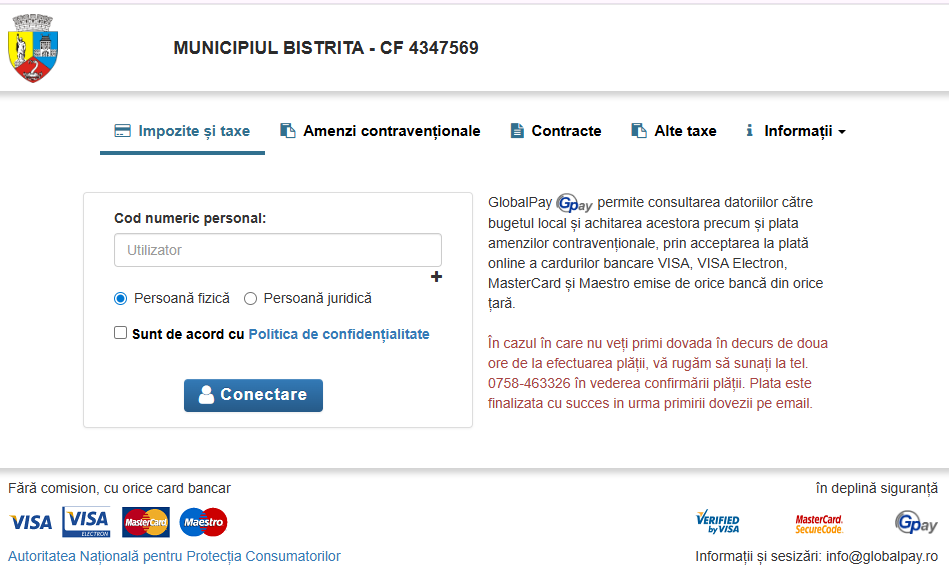 - Global Pay – aplicația de plată a Primăriei Municipiului Bistrița, prin care cetățenii pot consulta situația debitelor, pot efectua plăți online și pot gestiona obligațiile fiscale într-un mod simplu și eficient. Platforma este disponibilă la: https://www.globalpay.ro/…/debite/rediract/debite/lang/ro