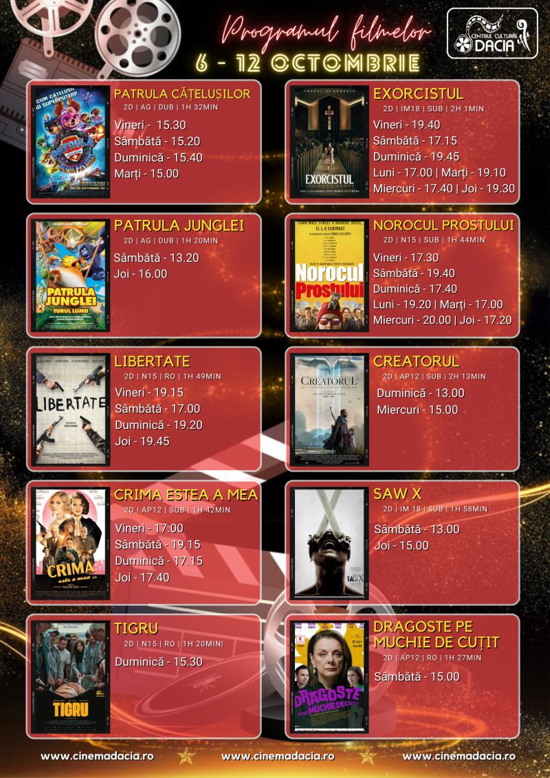 Iată, mai jos, programul complet al filmelor, la Cinema Dacia, în perioada 6 – 12 octombrie: