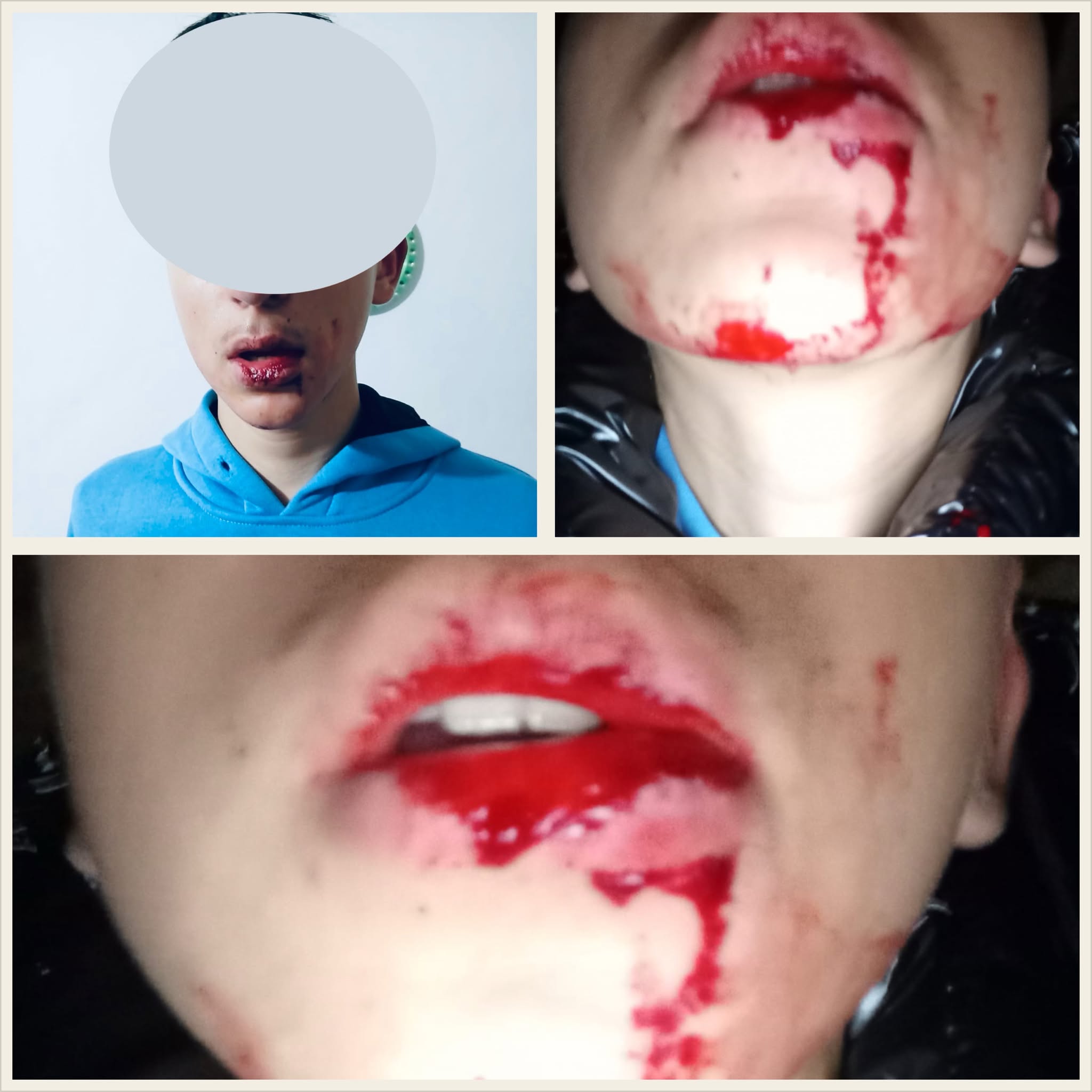 „După ce a căzut jos a simțit mai multe lovituri, la stomac, la spate, în cap. După ce a căzut jos a pus mâinile în cap și la față, pentru a se proteja și nu știe cine l-a lovit, dacă au participat și ceilalți. Și-a pierdut conștiența….își amintește că l-au scuipat în față și i s-a lăsat rău și a început să scuipe sânge. A ajuns șocat acasă, nu a putut nici măcar să mă sune pe mine… Când l-am văzut plin de sânge m-am șocat și eu… nici nu știam cum să reacționez. Noi nu suntem o familie violentă, nu am fost implicat niciodată în bătăi, nici eu, nici tata, nici copilul… nu știam cum să reacționăm”, a declarat tatăl adolescentului, pentru Bistrițeanul.ro