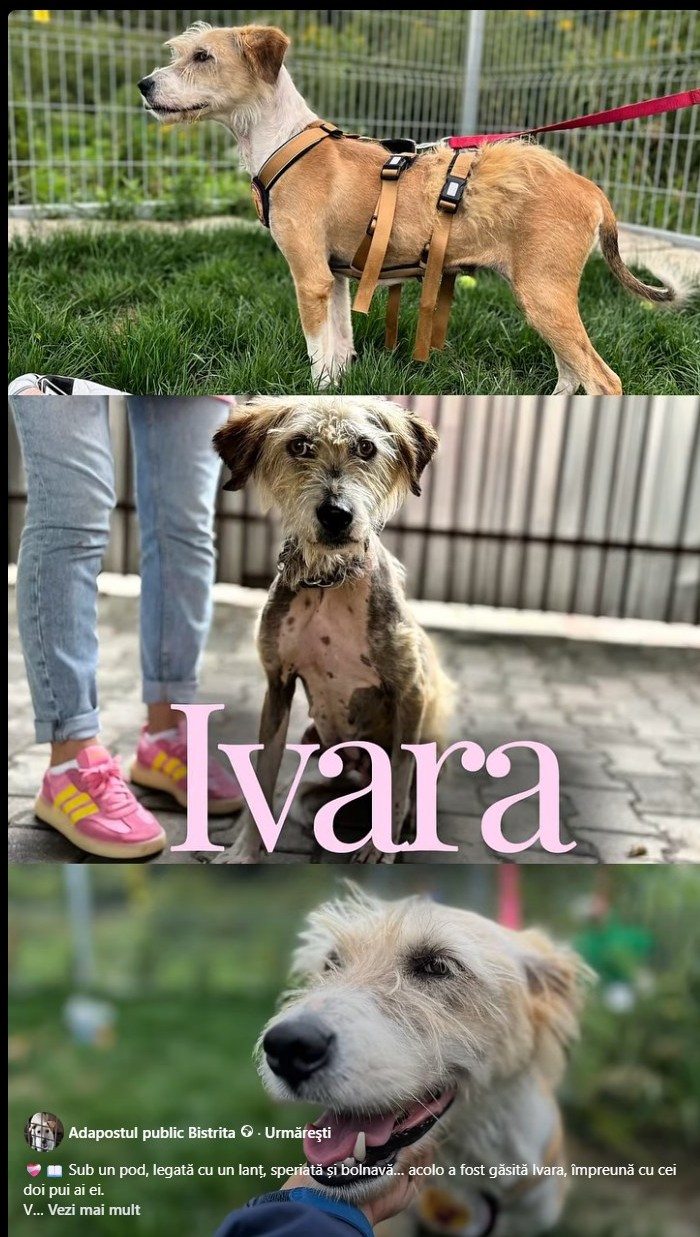 ”Sub un pod, legată cu un lanț, speriată și bolnavă… acolo a fost găsită Ivara, împreună cu cei doi pui ai ei. Viața nu a fost blândă cu ea, iar pierderea puiuților din cauza parvovirozei a fost cea mai grea lovitură.