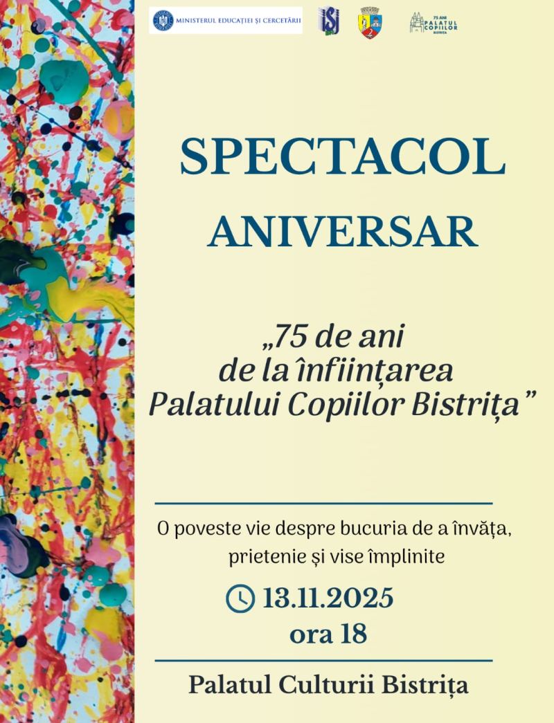 Joi, 13 noiembrie, de la ora 18.00, la Palatul Culturii are loc spectacolul care va încununa activitățile prin care noi am aniversat, pe tot parcursul acestui an, cei 75 de ani de activitate. Vă așteptăm cu emoție, cu muzică, poezie și dans.
