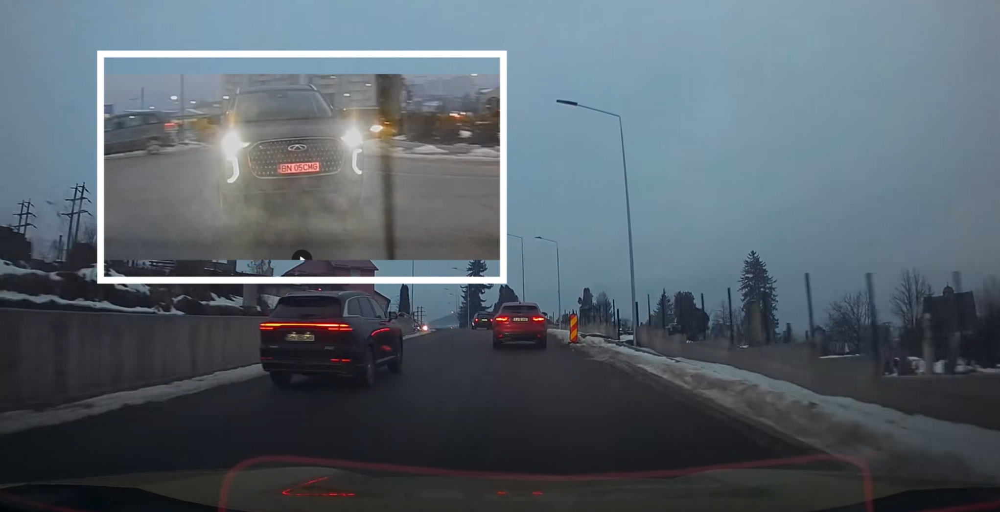 ”BN-05-CMG Accident evitat de cei din sens opus care au oprit să „acorde prioritate” bizonului cu mașina chinezească” este mesajul care apare în online.