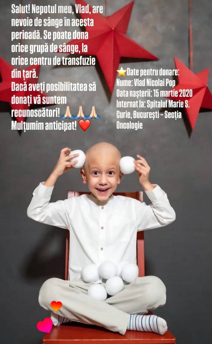 Viața unei familii s-a rupt în două, în urmă cu patru luni, când Vlad, un băiețel de doar 5 anișori, a primit un diagnostic crunt: Limfom Burkitt, stadiul 4. El este internat la Spitalul Marie Curie din București, Secția Oncologie, și are nevoie de sânge în această perioadă. Familia sa face un apel către toți cei care pot dona sânge.