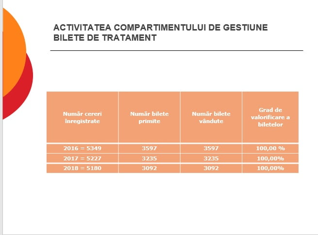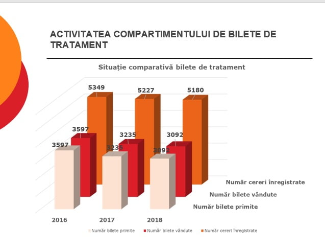 Și numărul de solicitări bilete de tratament scade de la an la an, dar nu cu o diferență așa de mare. În 2016 s-au solicitat 5.349 de bilete, iar în 2018 au fost doar 5.180 cereri.