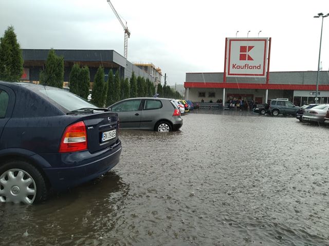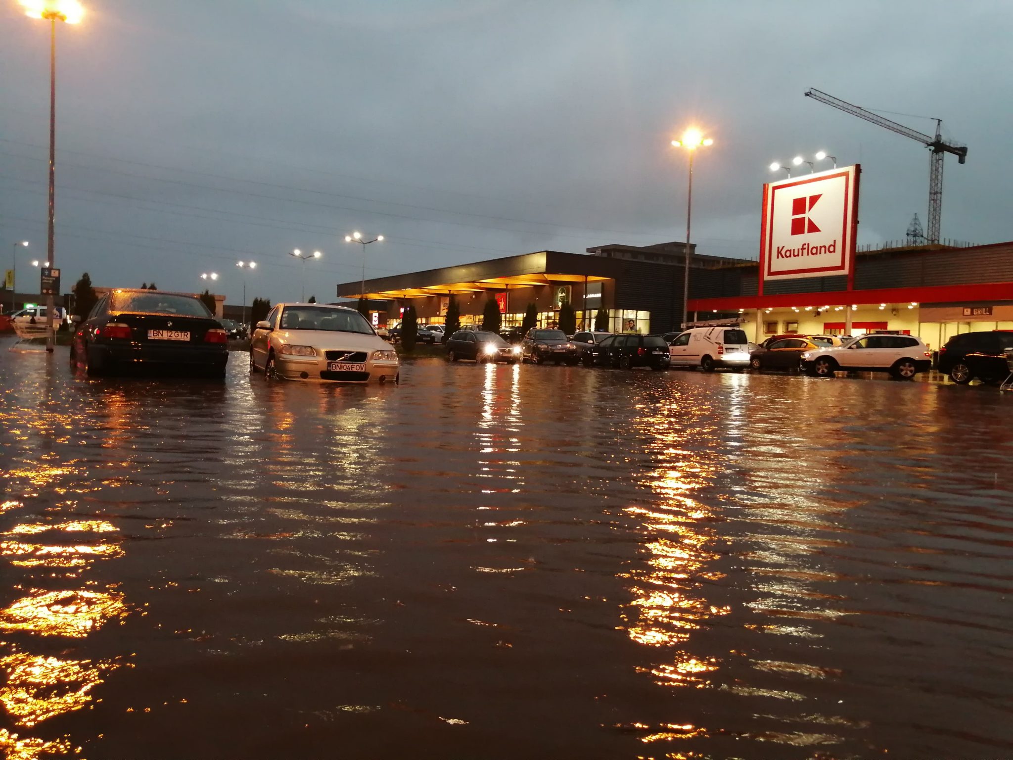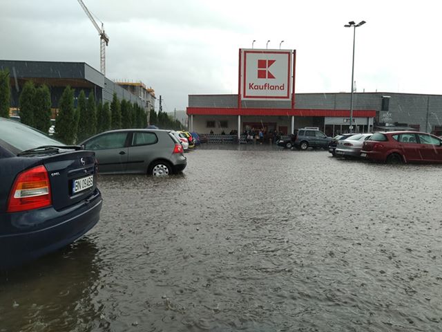 S-a întâmplat la Kaufland-ul de pe Calea Moldovei, unde apa a fost de aproximativ jumătate de metru în parcare. Coșurile de cumpărături abandonate în parcarea magazinului au fost luate de apă și purtate prin toată parcarea. Probleme au fost și la Selgros.