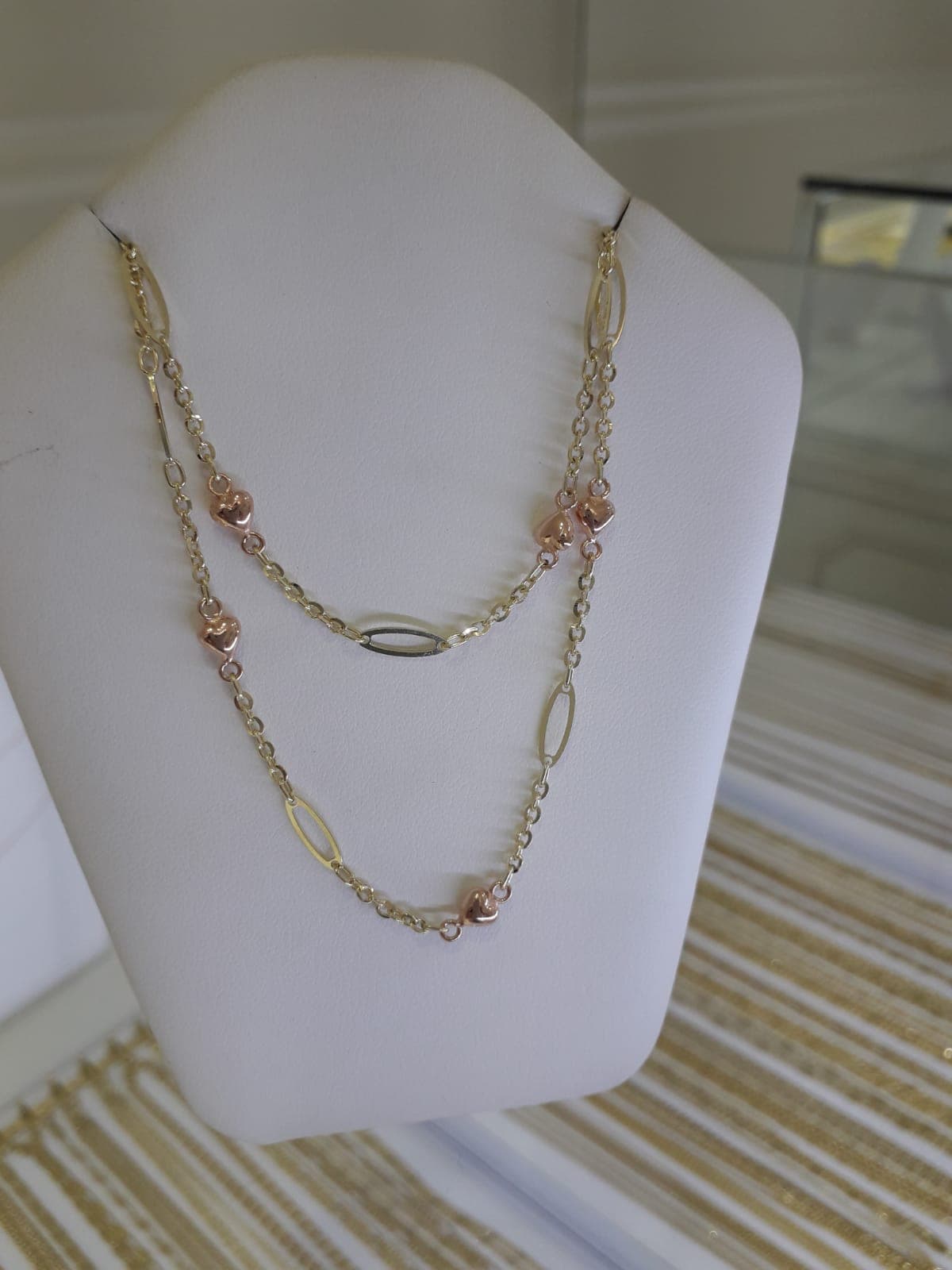 Poți alege un set format din lănțișor și cercei. Sau poți să-i scrii numele din litere de aur. Să i-l pui apoi salbă la gât sau brățară la mână.